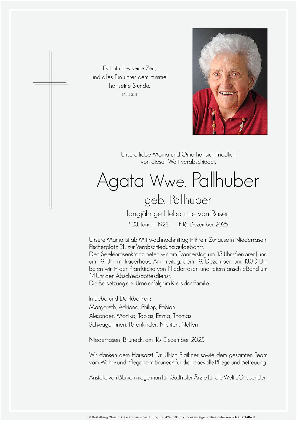 Den Seelenrosenkranz beten wir am Donnerstag um 15 Uhr (Senioren) und um 19 Uhr im Trauerhaus. Am Freitag, dem 19. Dezember, um 13.30 Uhr beten wir in der Pfarrkirche von Niederrasen und feiern anschließend um 14 Uhr den Abschiedsgottesdienst.