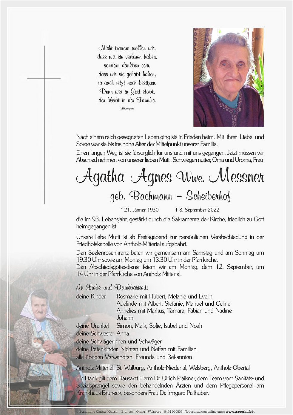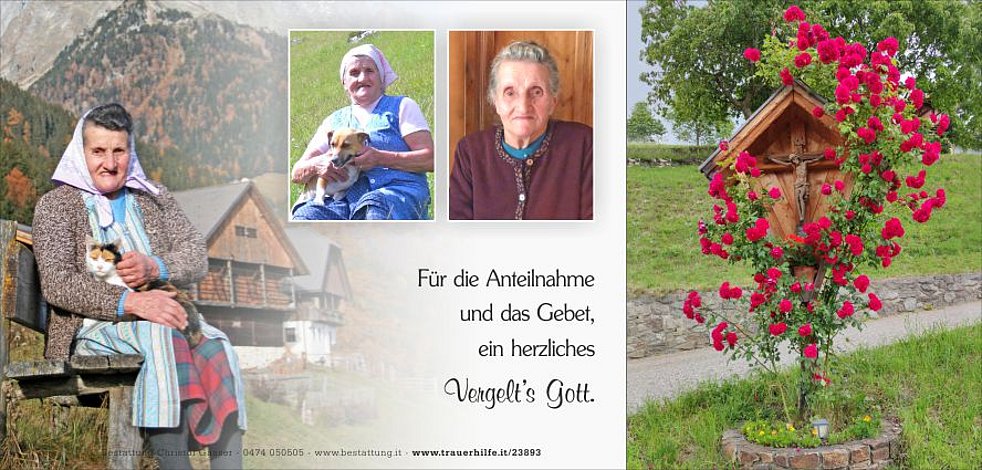 Ein Dank gilt dem Hausarzt Herrn Dr. Ulrich Plaikner, dem Team vom Sanitäts- und Sozialsprengel sowie den behandelnden Ärzten und dem Pflegepersonal am Krankhaus Bruneck, besonders Frau Dr. Irmgard Pallhuber.