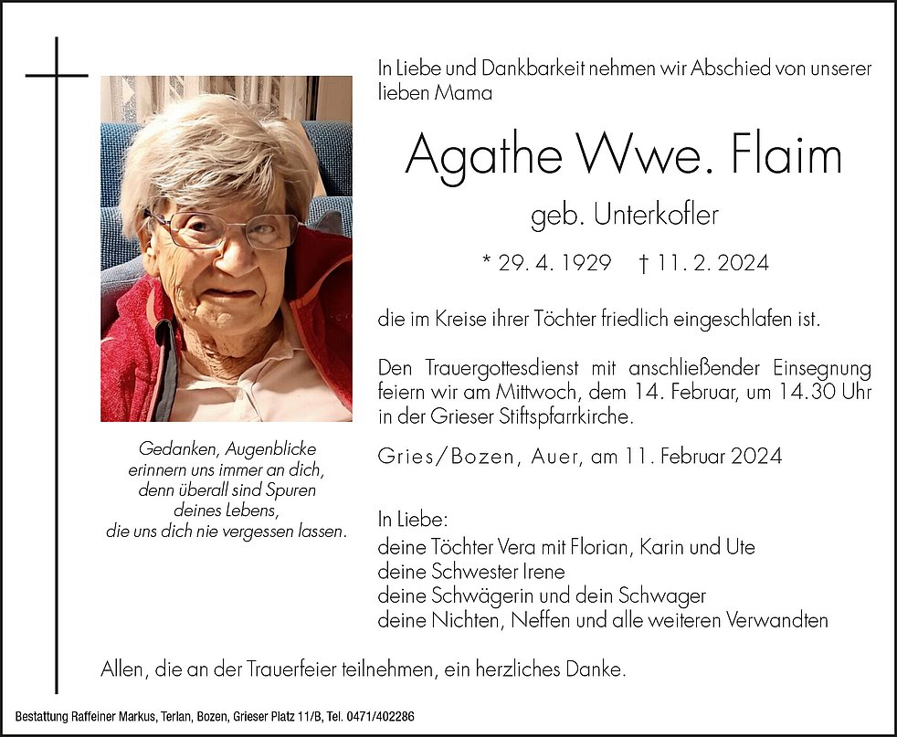 Den Trauergottesdienst mit anschließender Einsegnung feiern wir am Mittwoch, dem 14. Februar, um 14.30 Uhr in der Grieser Stiftspfarrkirche.