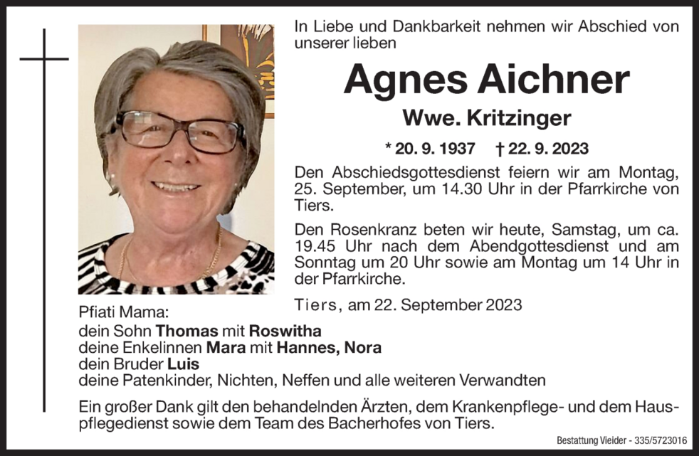 Ein großer Dank gilt den behandelnden Ärzten, dem Krankenpflege- und dem Hauspflegedienst sowie dem Team des Bacherhofes von Tiers.