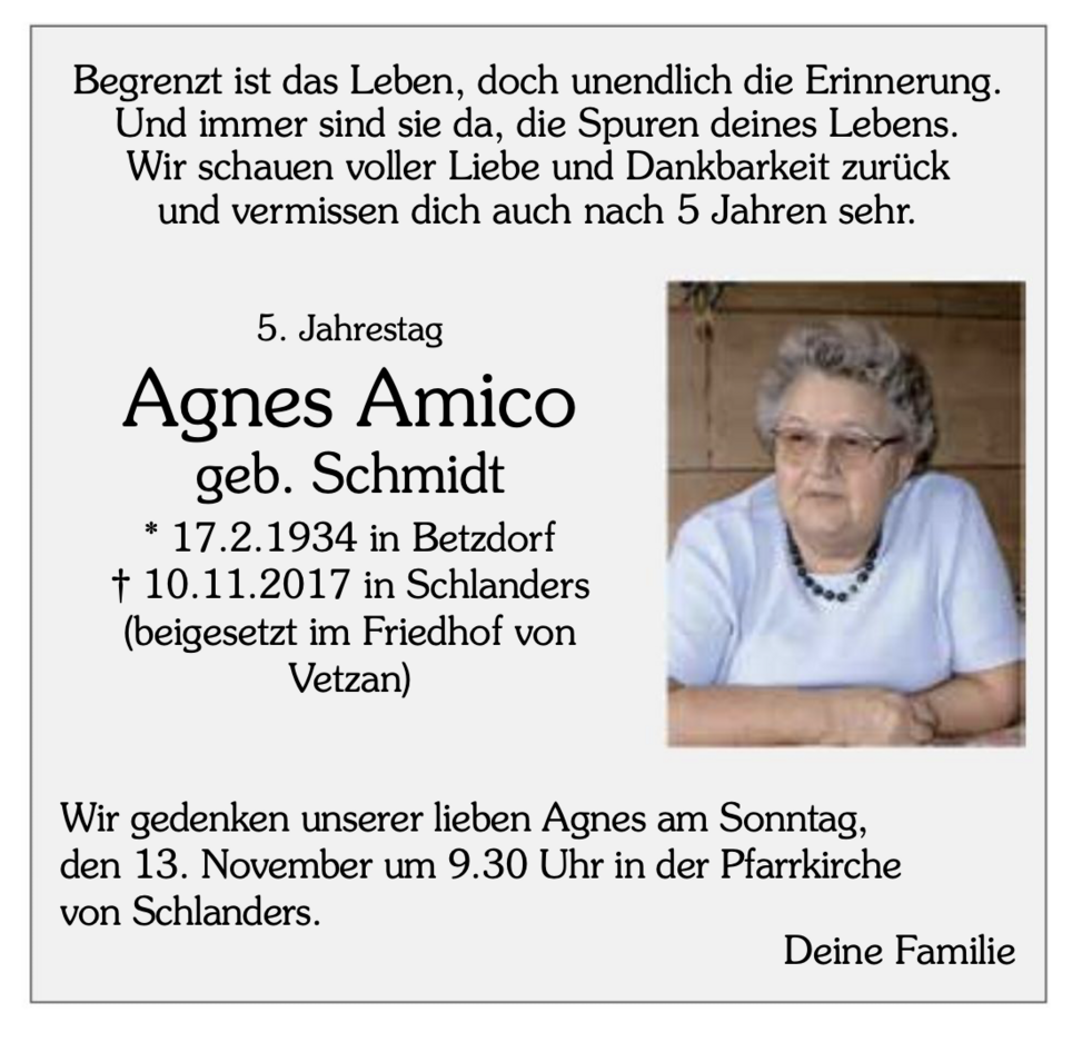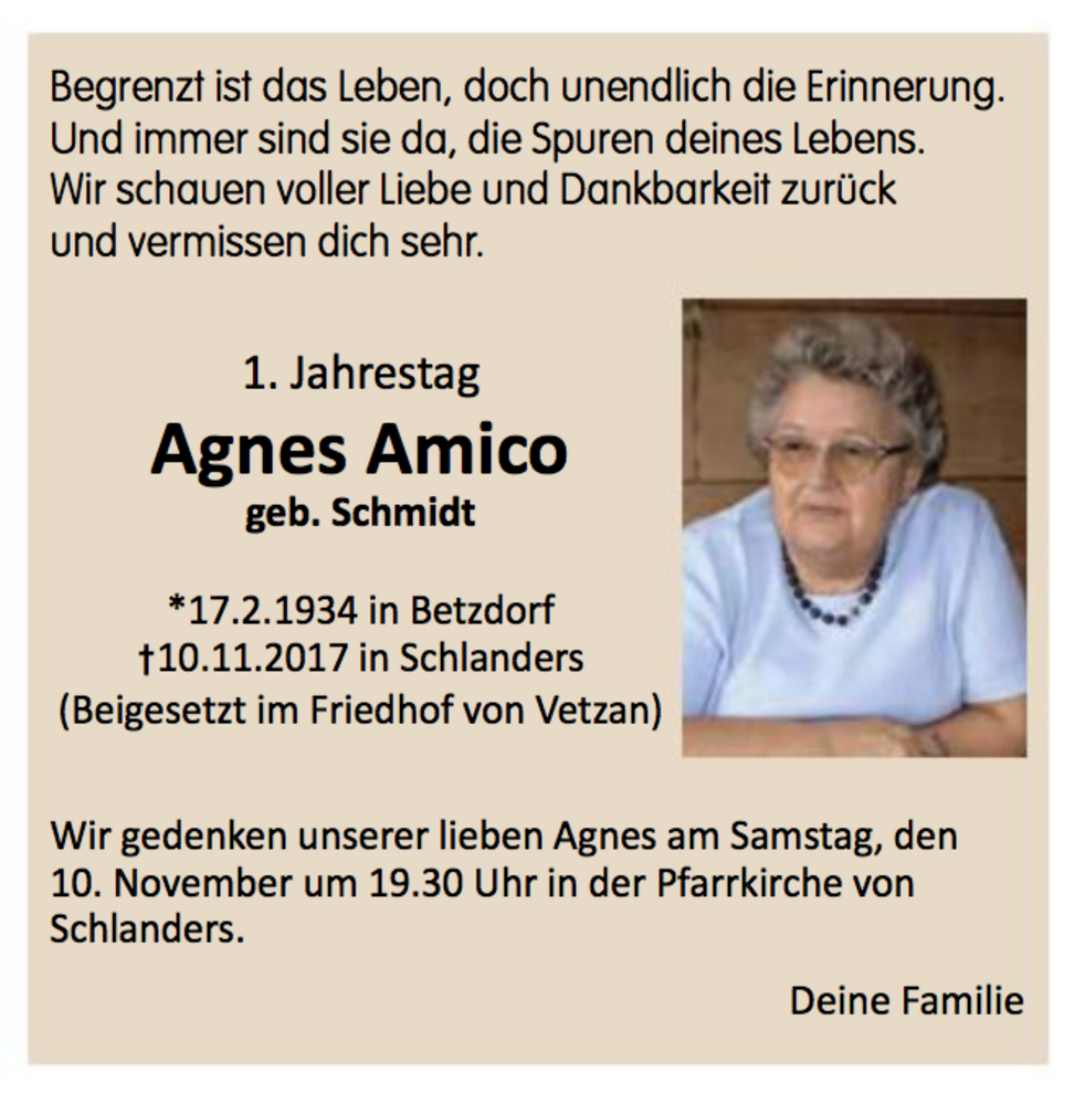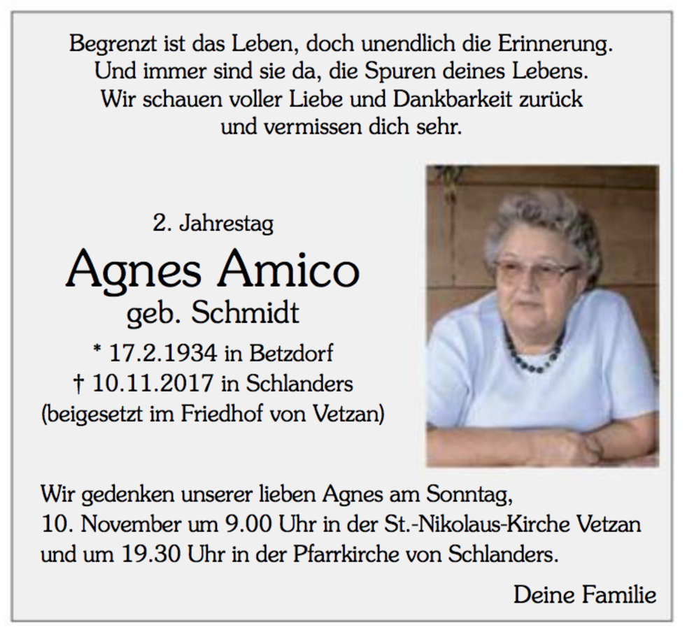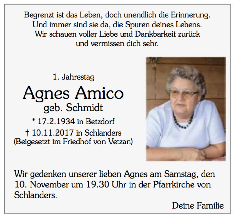 Wir begleiten unsere liebe Agnes am Montag, 13. November, um 14 Uhr vom Trauerhaus aus zum Begräbnisgottesdienst in die St.-Nikolaus-Kirche und anschließend zur letzten Ruhe auf den Ortsfriedhof von Vetzan.