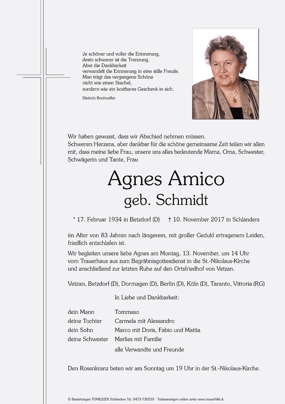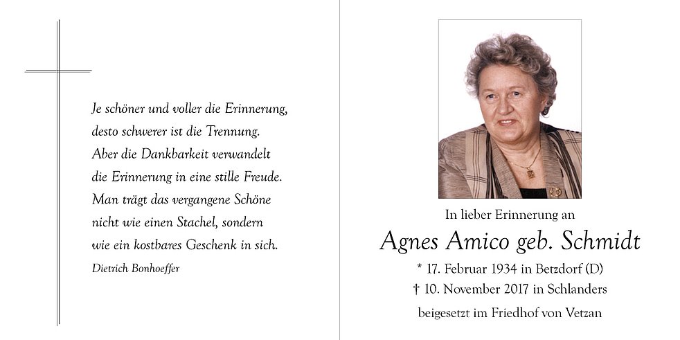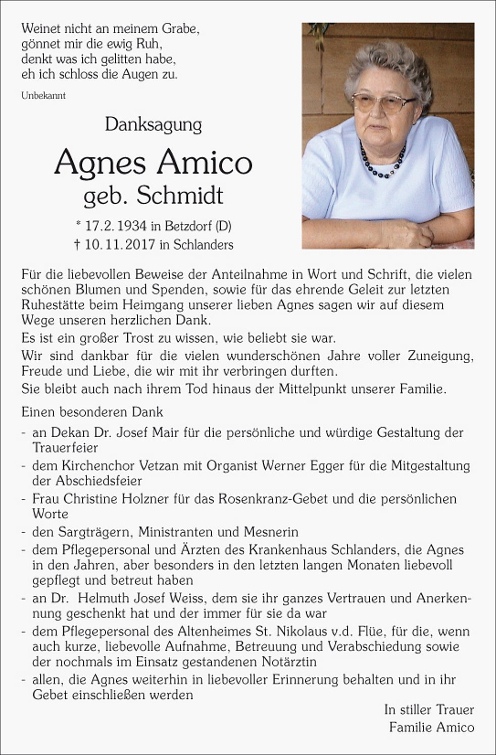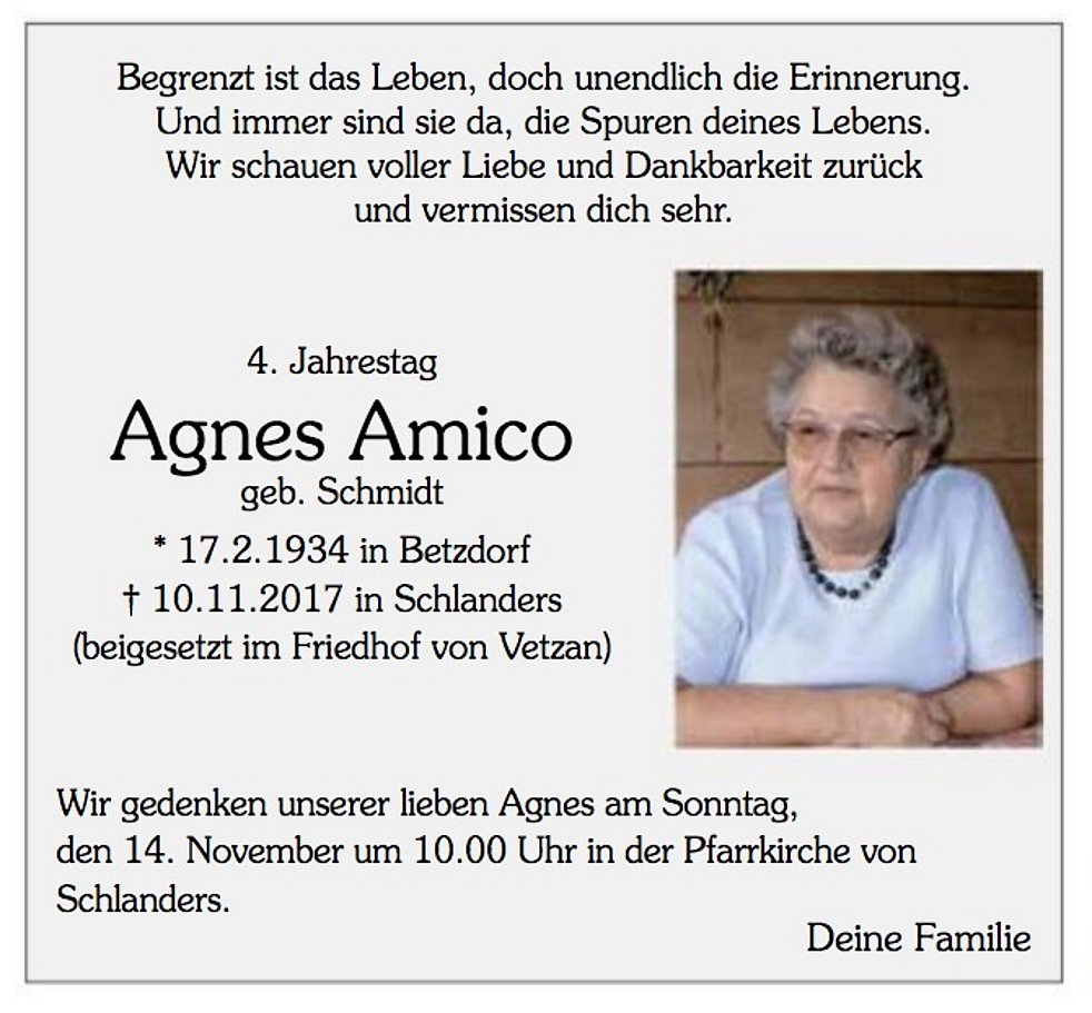 Wir begleiten unsere liebe Agnes am Montag, 13. November, um 14 Uhr vom Trauerhaus aus zum Begräbnisgottesdienst in die St.-Nikolaus-Kirche und anschließend zur letzten Ruhe auf den Ortsfriedhof von Vetzan.