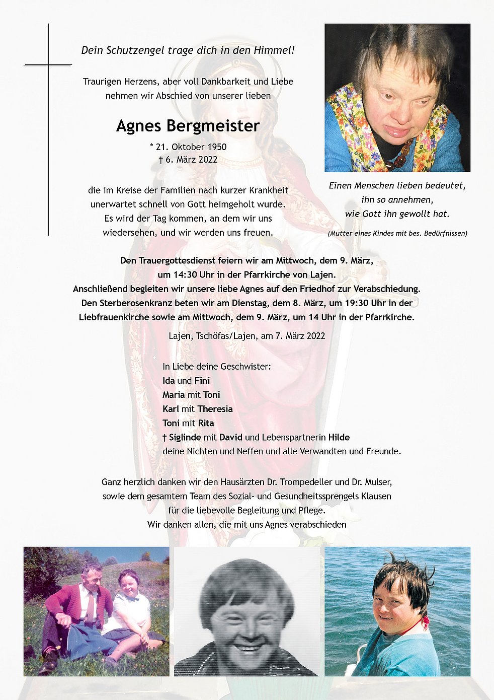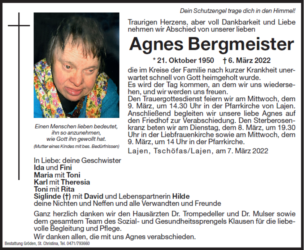 Den Trauergottesdienst feiern wir am Mittwoch, dem 9. März, um 14:30 Uhr in der Pfarrkirche von Lajen. Anschließend begleiten wir unsere liebe Agnes auf den Friedhof zur Verabschiedung.