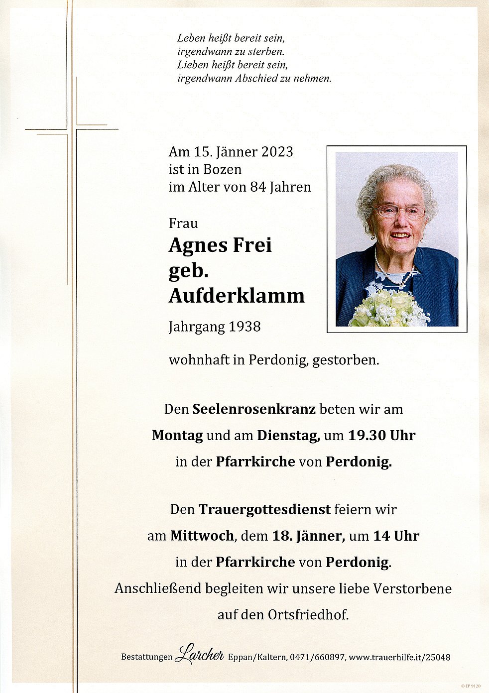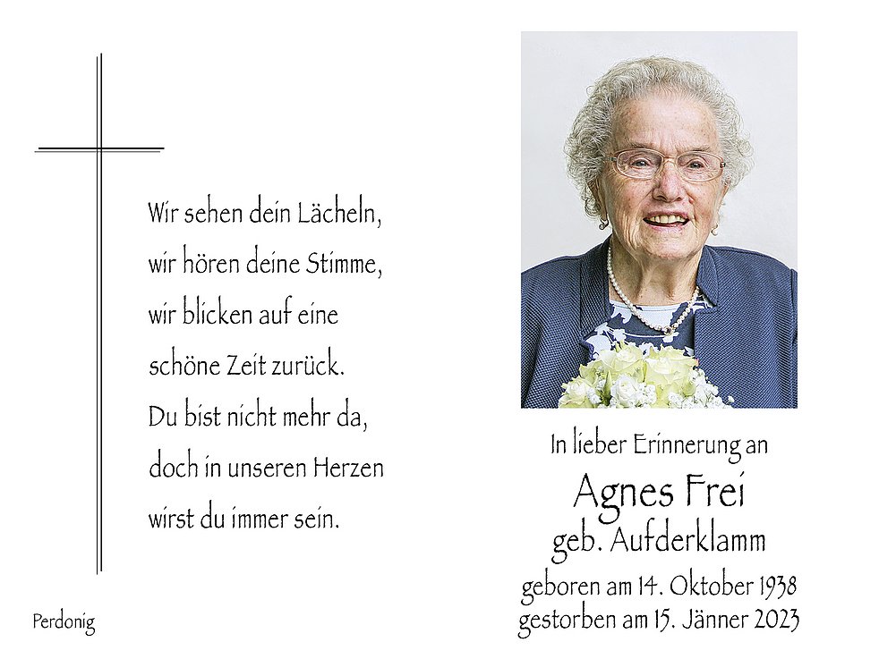 Den Trauergottesdienst feiern wir am Mittwoch, dem 18. Jänner um 14 Uhr in der Pfarrkirche von Perdonig. Anschließend begleiten wir unsere liebe Verstorbene zur letzten Ruhe auf den Ortsfriedhof.