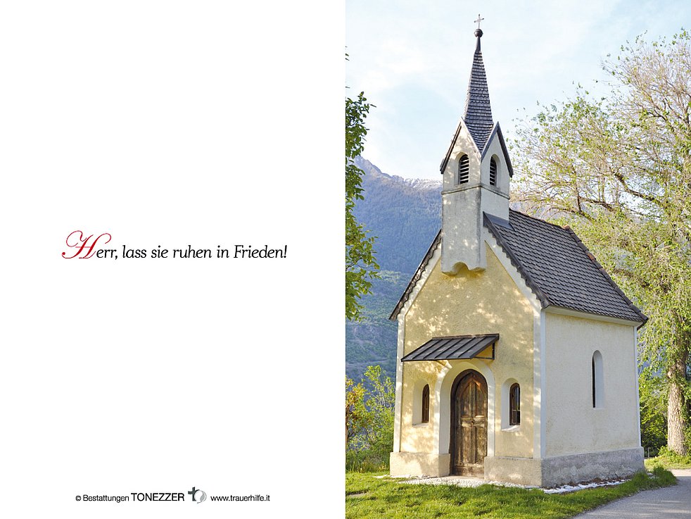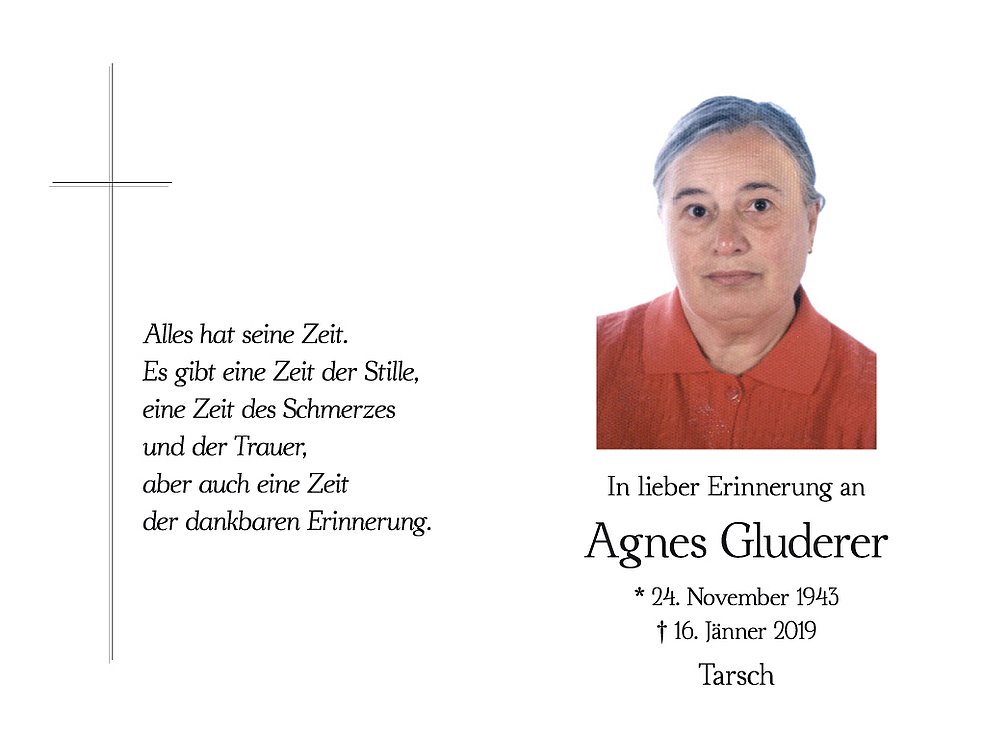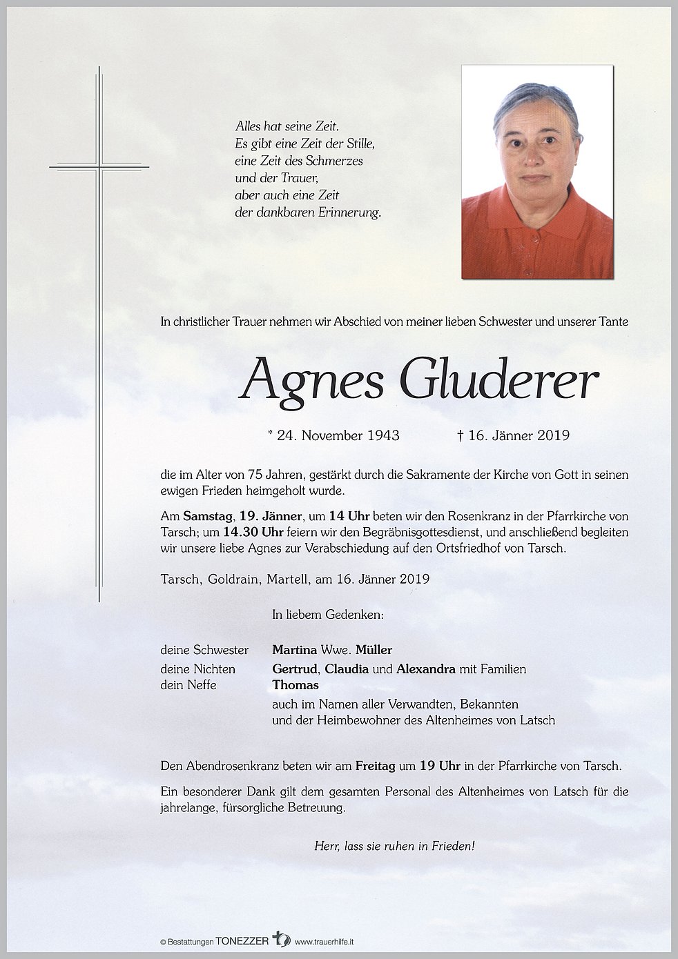 Am Samstag, 19. Jänner, um 14 Uhr beten wir den Rosenkranz in der Pfarrkirche von Tarsch; um 14.30 Uhr feiern wir den Begräbnisgottesdienst, und anschließend begleiten wir unsere liebe Agnes zur Verabschiedung auf den Ortsfriedhof von Tarsch.