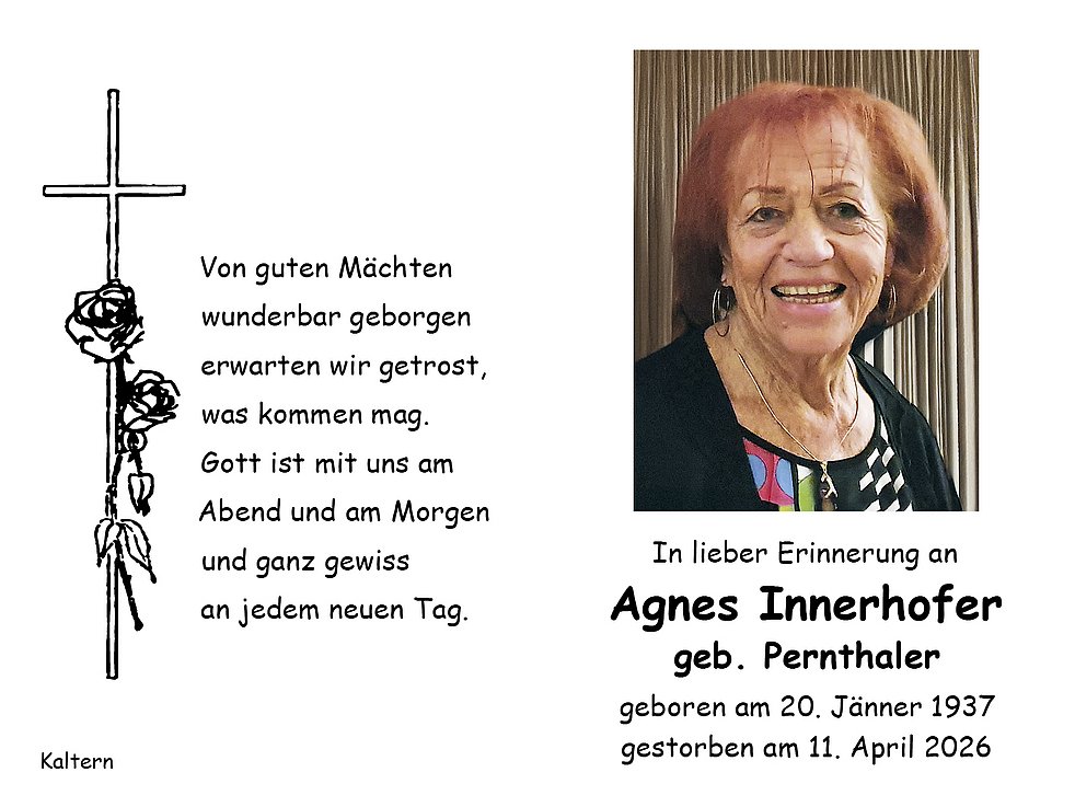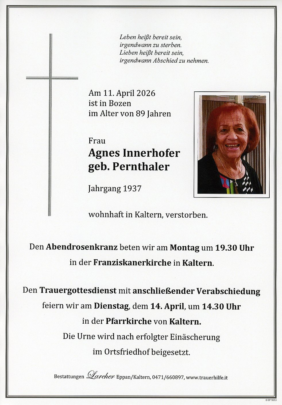 Den Trauergottesdienst mit anschließender Verabschiedung feiern wir am Dienstag, dem 14. April um 14.30 Uhr in der Pfarrkirche von Kaltern.