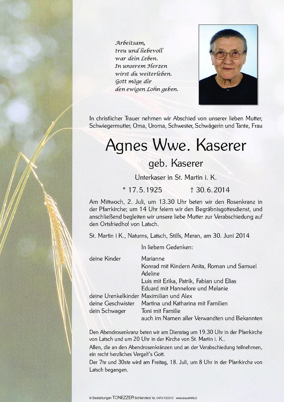Am Mittwoch, 2. Juli, um 13.30 Uhr beten wir den Rosenkranz in der Pfarrkirche; um 14 Uhr feiern wir den Begräbnisgottesdienst, und anschließend begleiten wir unsere liebe Mutter zur Verabschiedung auf den Ortsfriedhof von Latsch.
