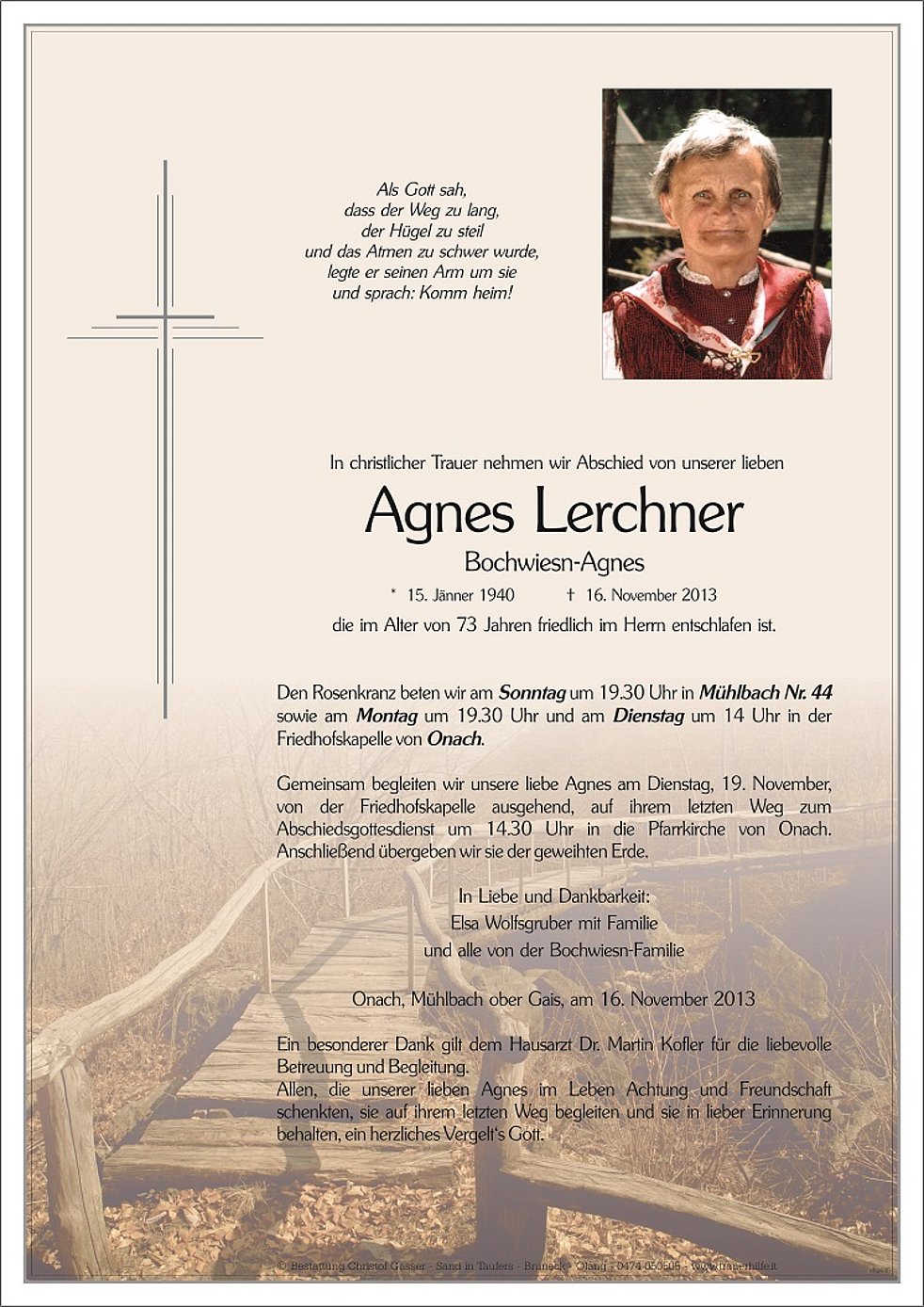 Gemeinsam begleiten wir unsere liebe Agnes am Dienstag, 19. November, von der Friedhofskapelle ausgehend, auf ihrem letzten Weg zum Abschiedsgottesdienst um 14.30 Uhr in die Pfarrkirche von Onach. Anschließend übergeben wir sie der geweihten Erde.
