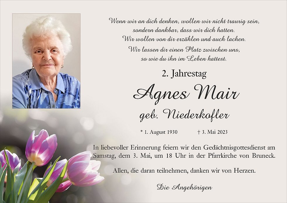 Ein besonderer Dank gilt Herrn Dr. Konrad Steinhauser, dem Hausarzt Herrn Dr. Mario Palma, den Ärzten und dem Pflegepersonal der Abteilungen Medizin und Palliativ am Krankenhaus Bruneck sowie dem Team der Langzeitpflege vom Wohn- und Pflegeheim Bruneck für die liebevolle Begleitung und Betreuung.