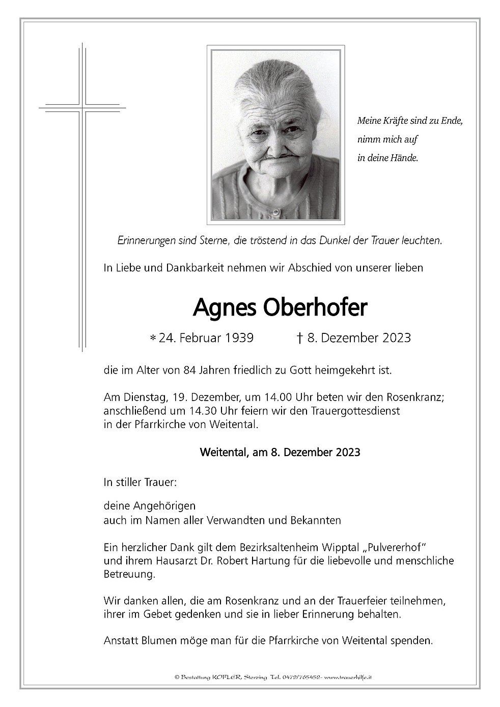 Am Dienstag, 19. Dezember, um 14.00 Uhr beten wir den Rosenkranz; anschließend um 14.30 Uhr feiern wir den Trauergottesdienst in der Pfarrkirche von Weitental.