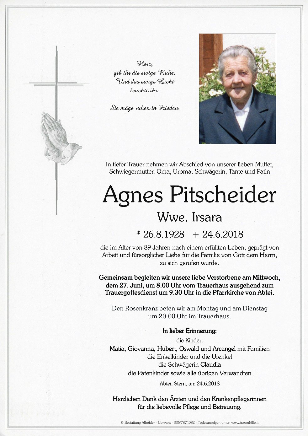 die im Alter von 89 Jahren nach einem erfüllten Leben, geprägt von Arbeit und fürsorglicher Liebe für die Familie von Gott dem Herrn, zu sich gerufen wurde.