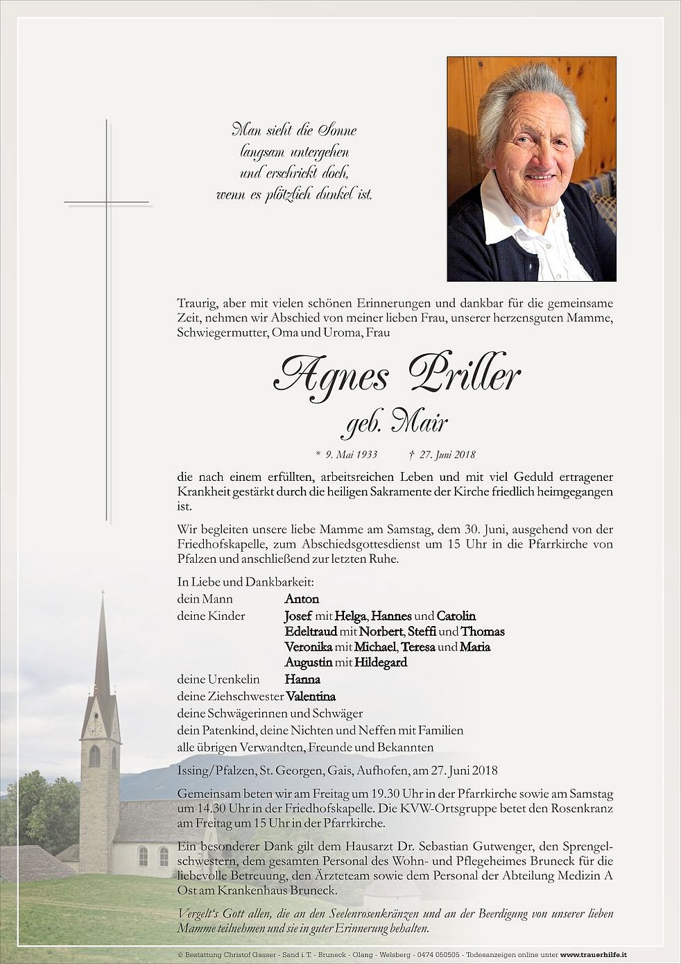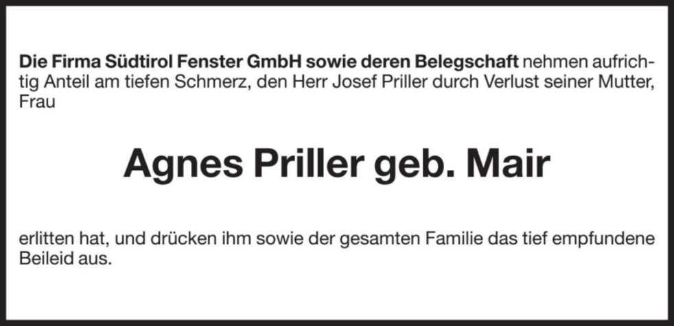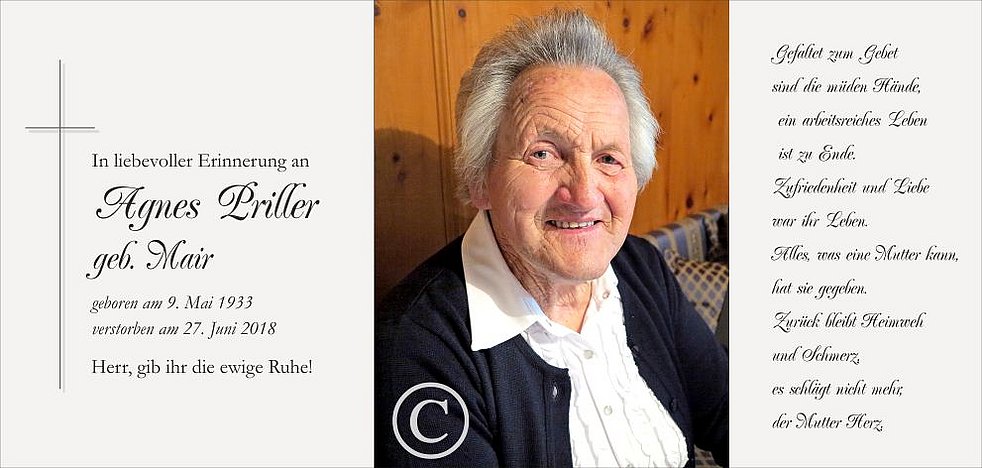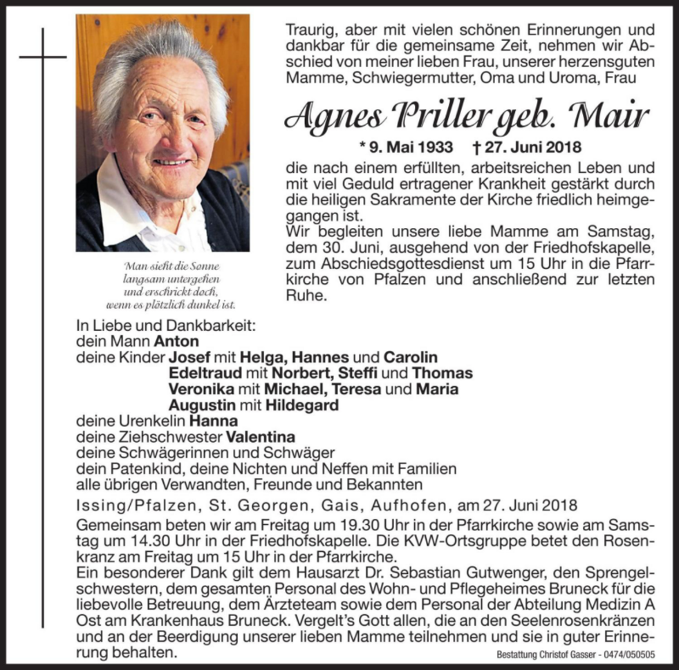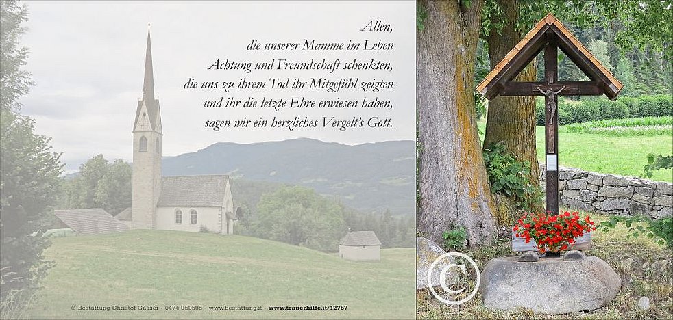 Wir begleiten unsere liebe Mamme am Samstag, dem 30. Juni, ausgehend von der Friedhofskapelle, zum Abschiedsgottesdienst um 15 Uhr in die Pfarrkirche von Pfalzen und anschließend zur letzten Ruhe.