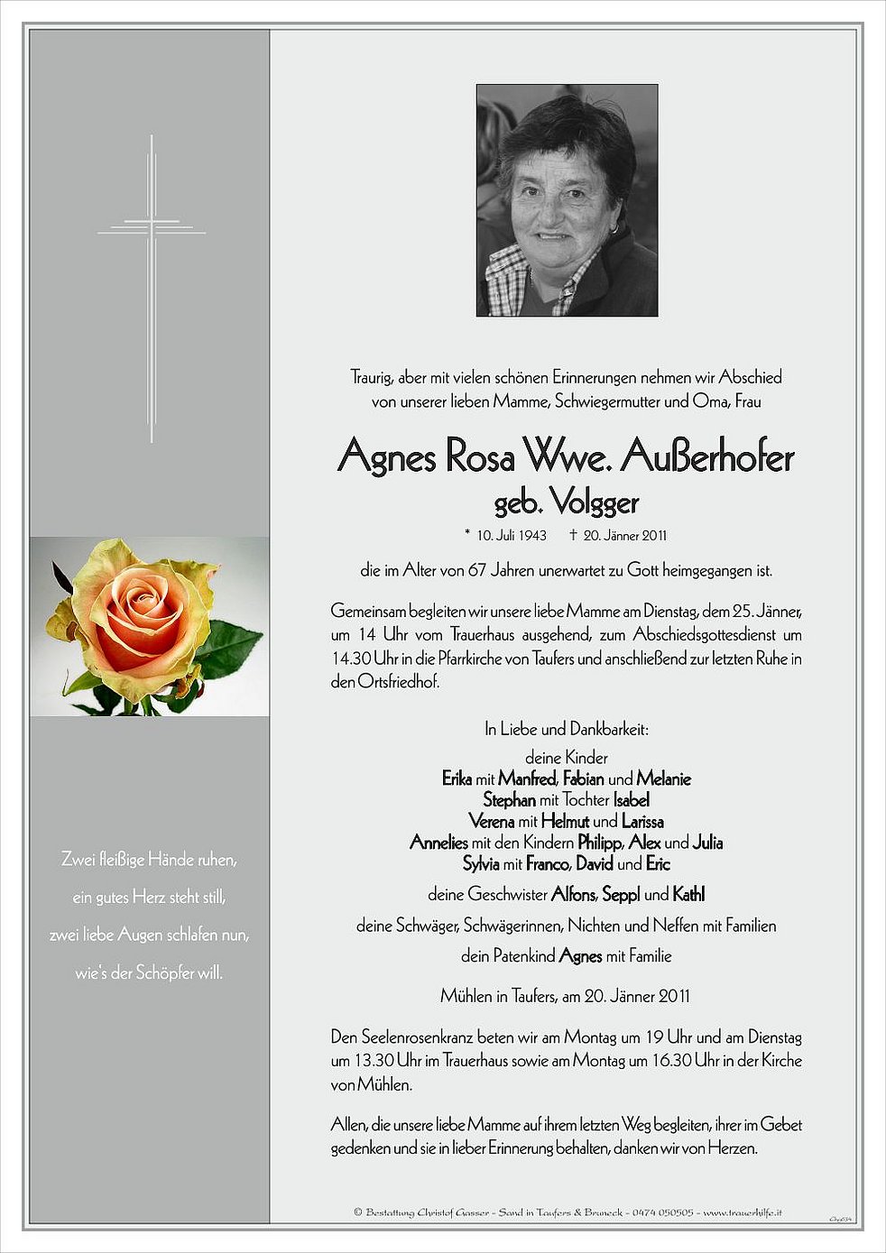 Gemeinsam begleiten wir unsere liebe Mamme am Dienstag, dem 25. Jänner, um 14 Uhr vom Trauerhaus ausgehend, zum Abschiedsgottesdienst um 14.30 Uhr in die Pfarrkirche von Taufers und anschließend zur letzten Ruhe in den Ortsfriedhof.