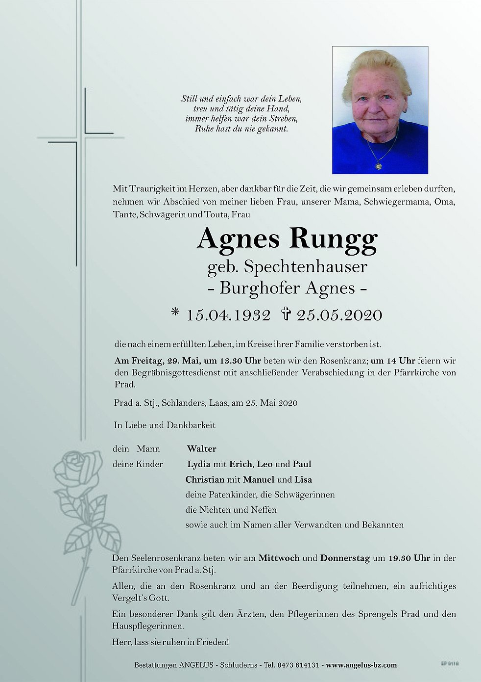 Am Freitag, 29. Mai, um 13.30 Uhr beten wir den Rosenkranz; um 14 Uhr feiern wir den Begräbnisgottesdienst mit anschließender Verabschiedung in der Pfarrkirche von Prad.
