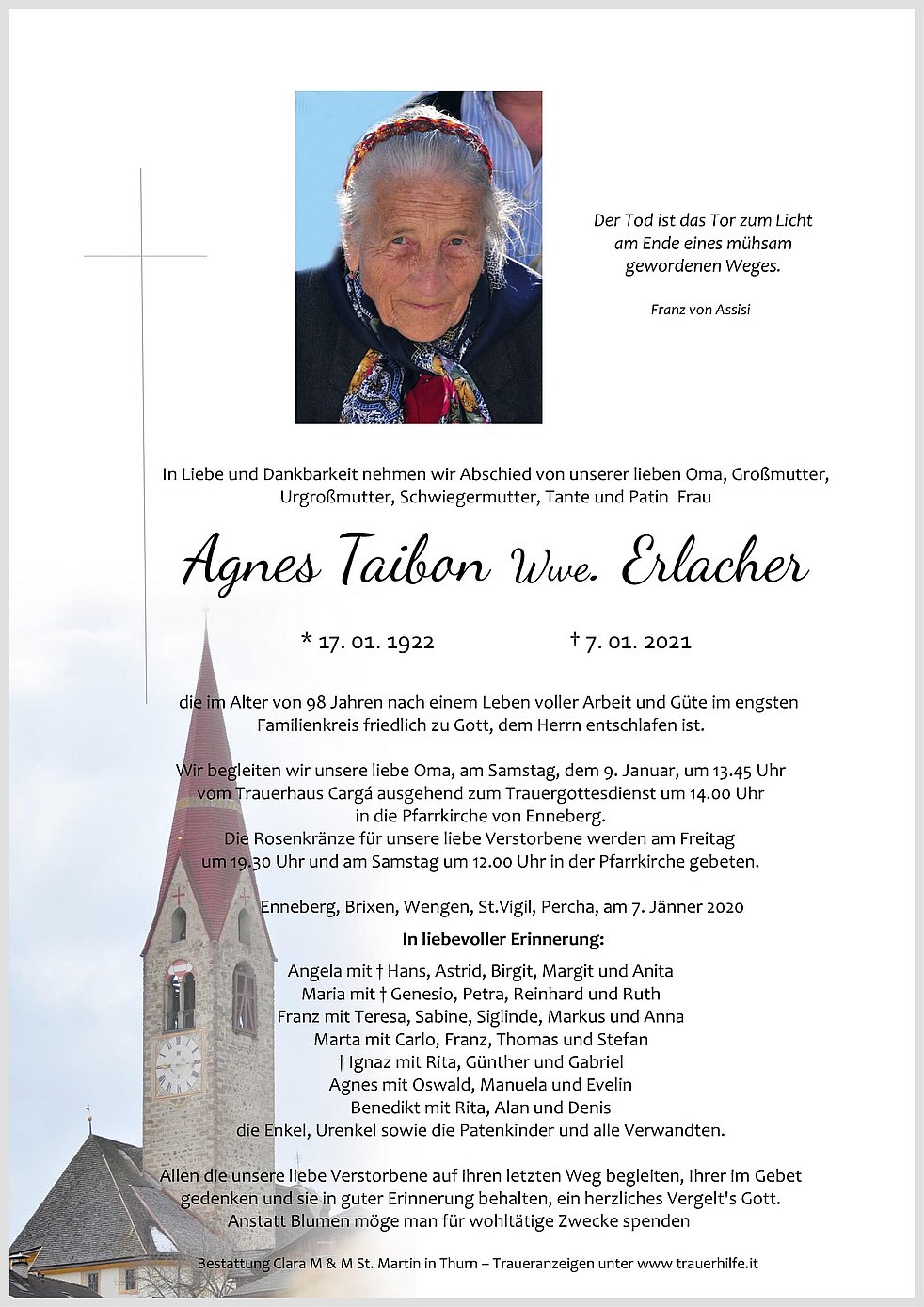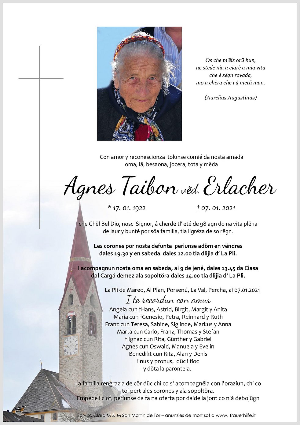 Wir begleiten unsere liebe Oma, am Samstag, dem 9. Januar, um 13.45 Uhr vom Trauerhaus Cargá ausgehend zum Trauergottesdienst um 14.00 Uhr in die Pfarrkirche von Enneberg.