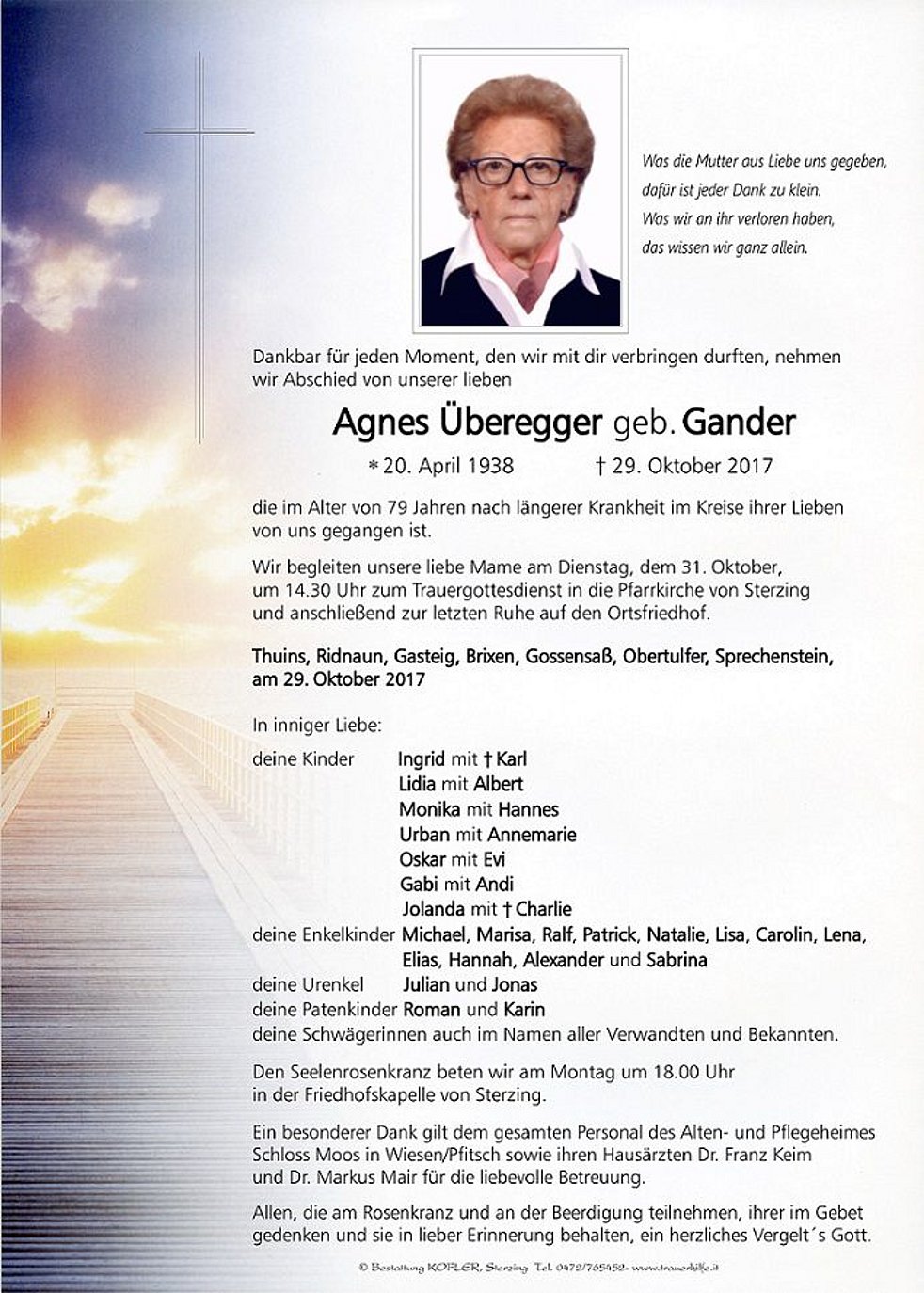 Wir begleiten unsere liebe Mame am Dienstag, dem 31. Oktober, um 14.30 Uhr zum Trauergottesdienst in die Pfarrkirche von Sterzing und anschließend zur letzten Ruhe auf den Ortsfriedhof.