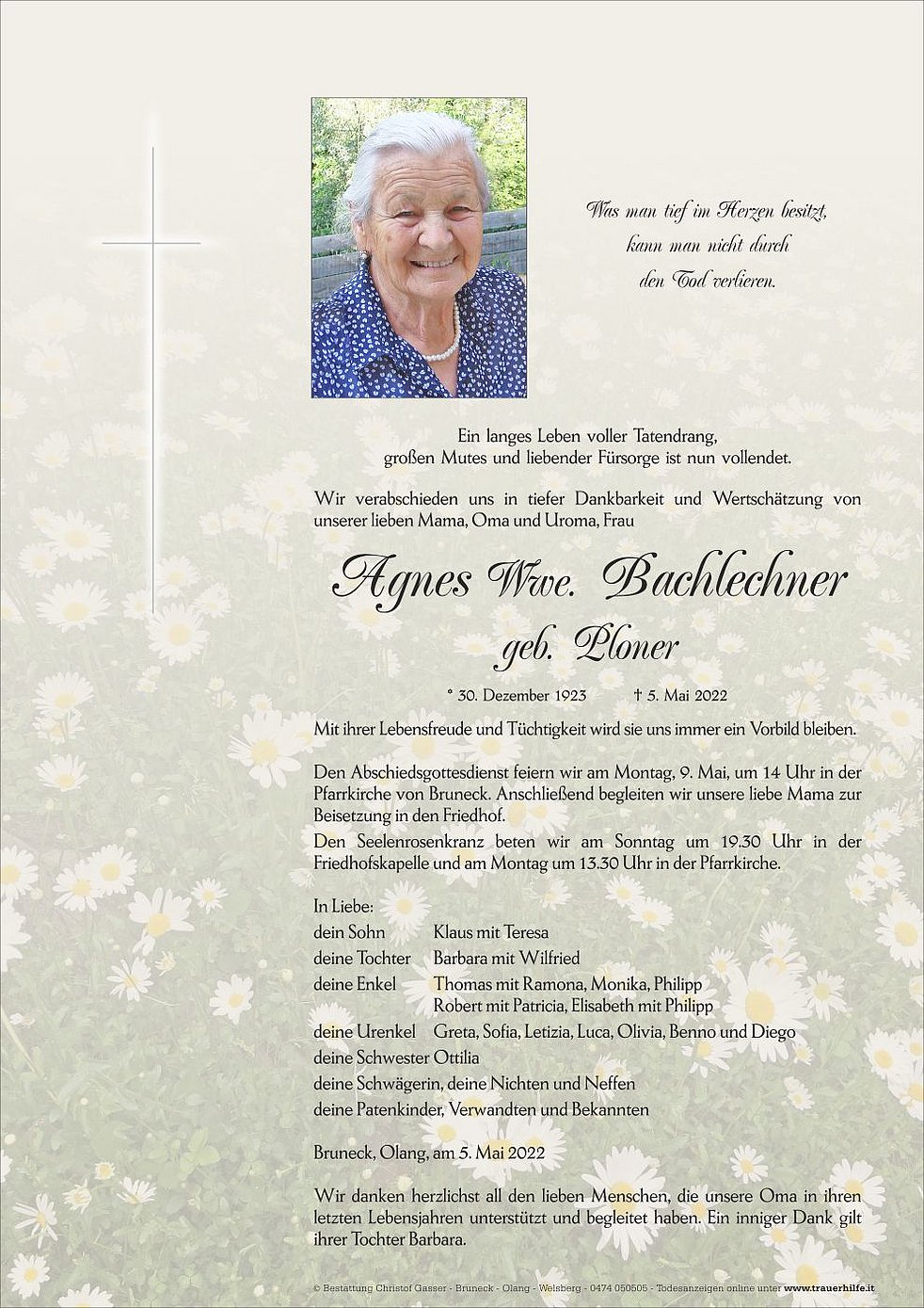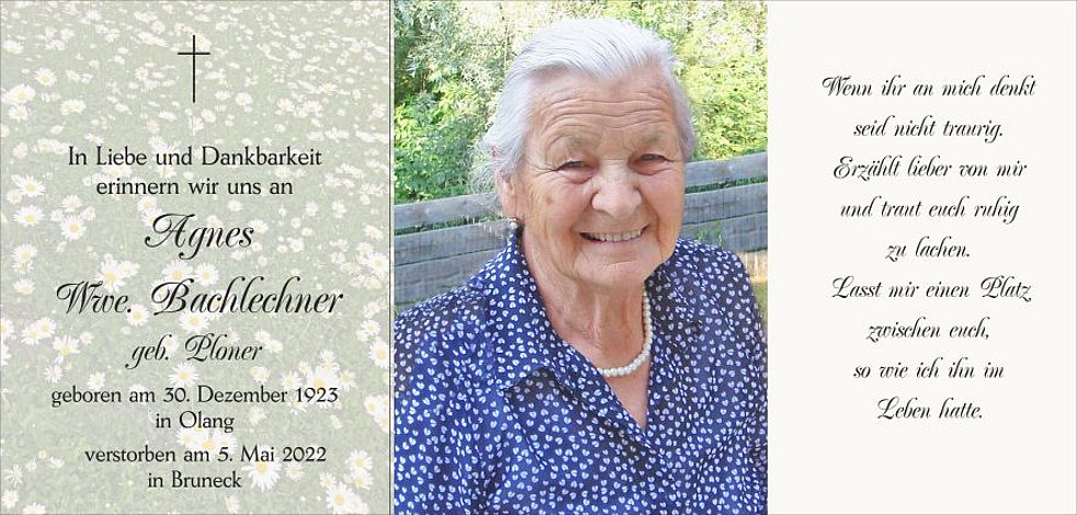 1952 heiratete sie Bernhard Bachlechner, doch leider verstarb dieser 9 Jahre später an einer Krankheit und Agnes zog die beiden Kinder Klaus und Barbara alleine groß.