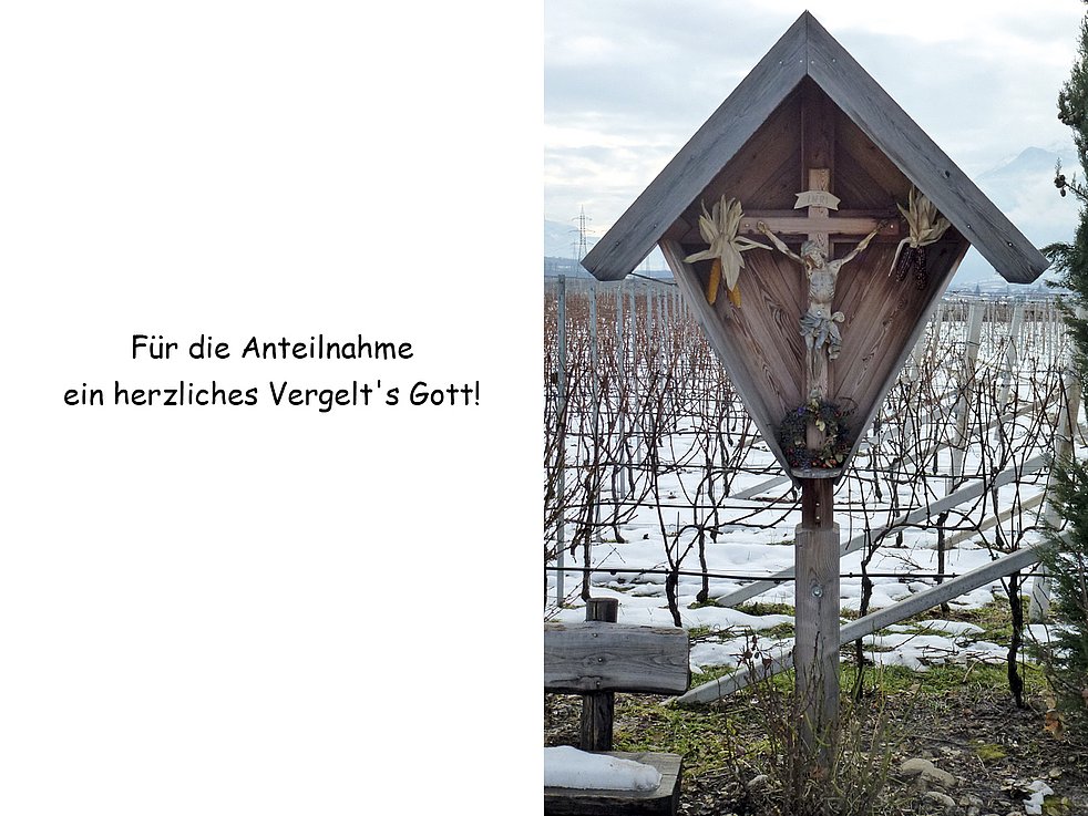 Ein besonderer Dank gilt dem Hausarzt Herrn Dr. Norbert Tinkhauser für die liebevolle Betreuung. Allen, die am Rosenkranz und an der Beerdigung teilnehmen, im Voraus ein herzliches Vergelt`s Gott.