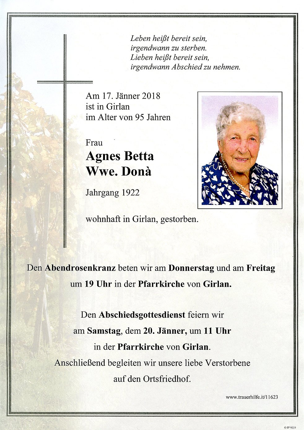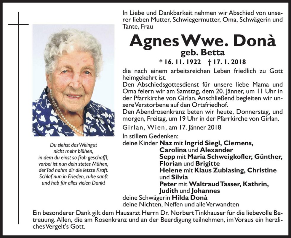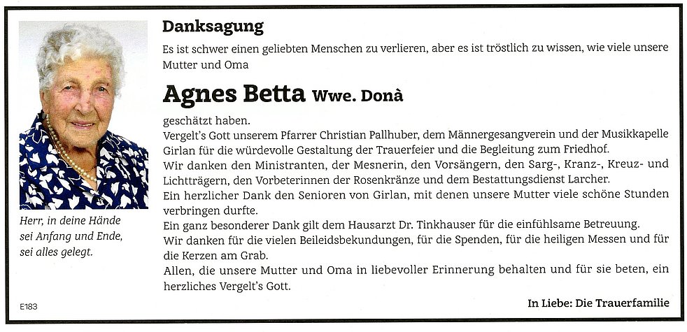 Den Abschiedsgottesdienst für unsere liebe Mama und Oma feiern wir am Samstag, dem 20. Jänner um 11 Uhr in der Pfarrkirche von Girlan. Anschließend begleiten wir unsere Verstorbene auf den Ortsfriedhof. Den Abendrosenkranz beten wir am Donnerstag und am Freitag um 19 Uhr in der Pfarrkirche von Girlan.