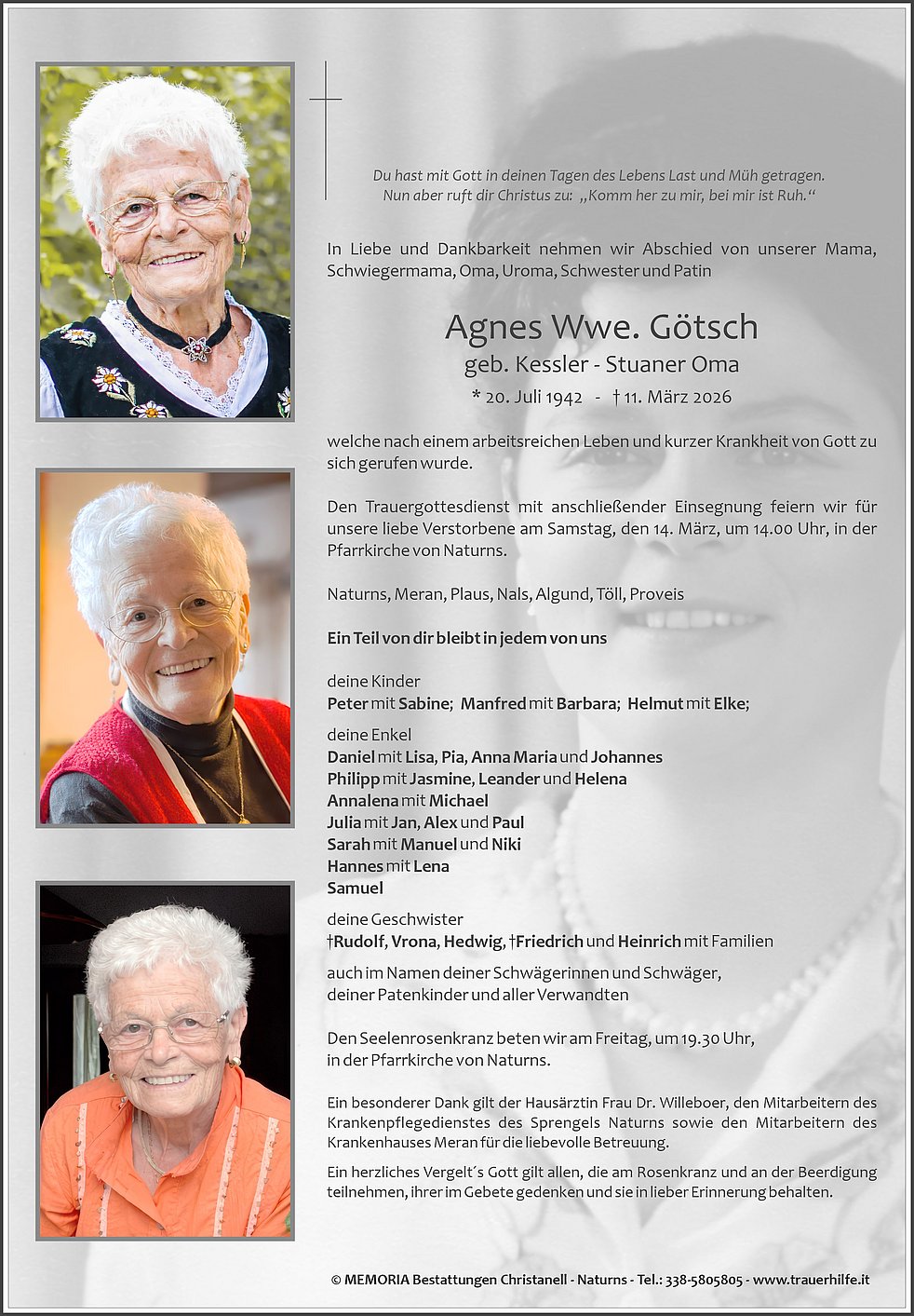 Den Trauergottesdienst mit anschließender Einsegnung feiern wir für unsere liebe Verstorbene am Samstag, den 14. März, um 14.00 Uhr, in der Pfarrkirche von Naturns.
