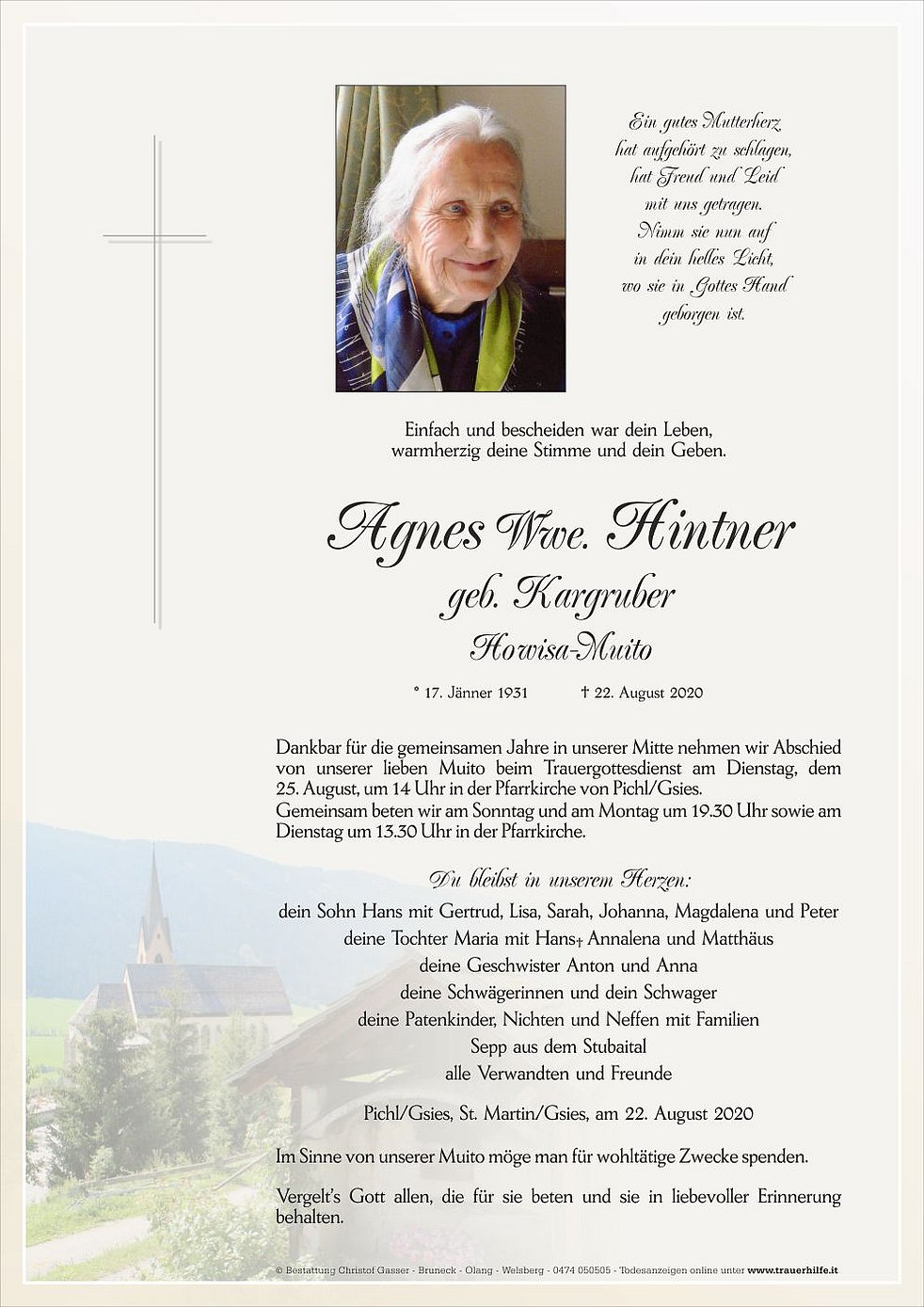 25. August, um 14 Uhr in der Pfarrkirche von Pichl/Gsies.