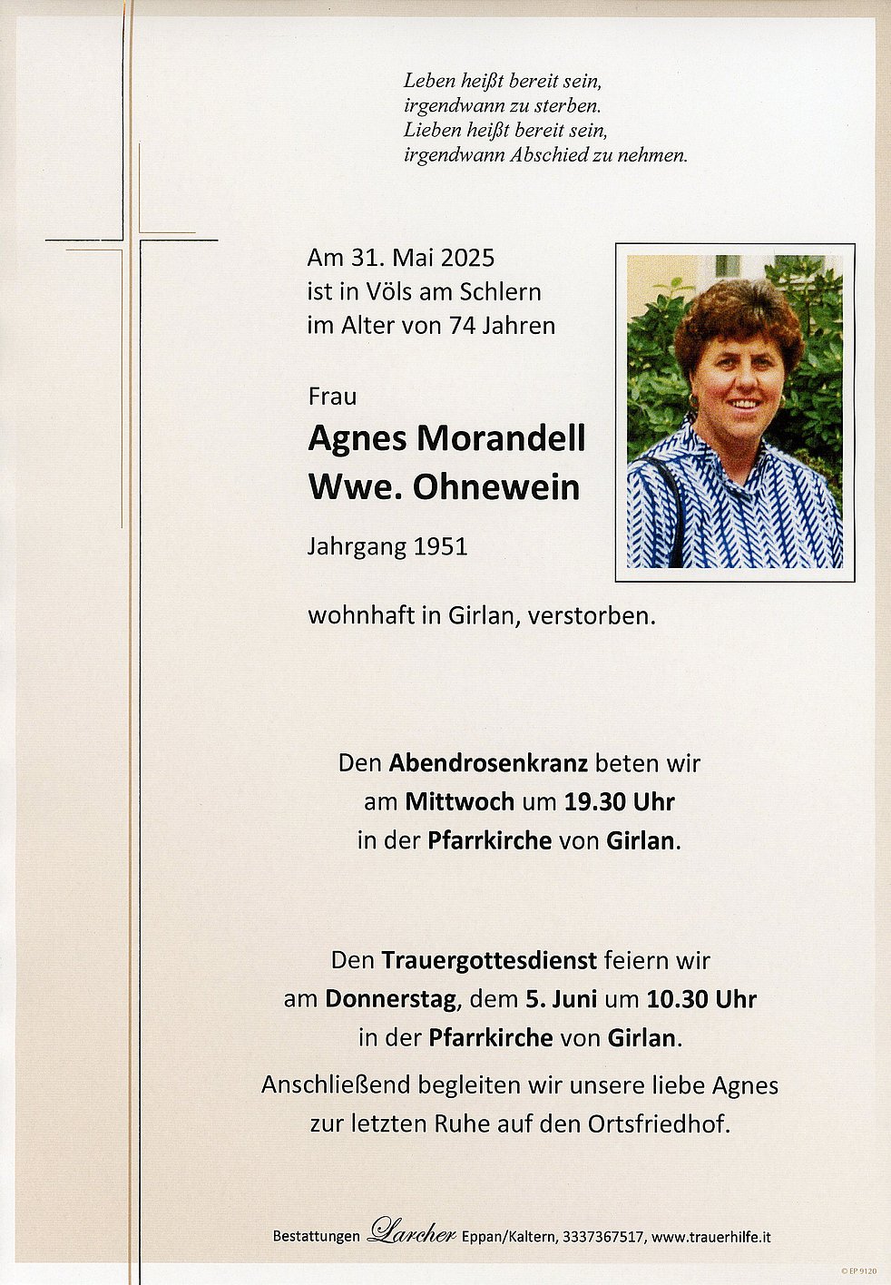Den Trauergottesdienst feiern wir am Donnerstag, dem 5. Juni um 10.30 Uhr in der Pfarrkirche von Girlan. Anschließend begleiten wir unsere liebe Verstorbene auf den Ortsfriedhof.
