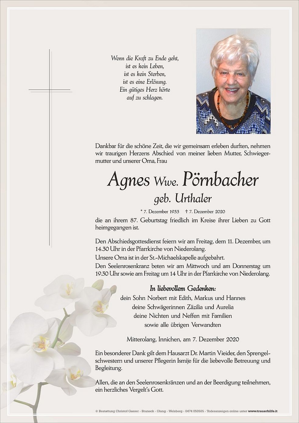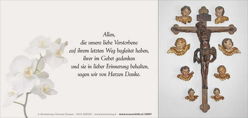 Ein besonderer Dank gilt dem Hausarzt Dr. Martin Vieider, den Sprengel-schwestern und unserer Pflegerin Ismije für die liebevolle Betreuung und Begleitung.