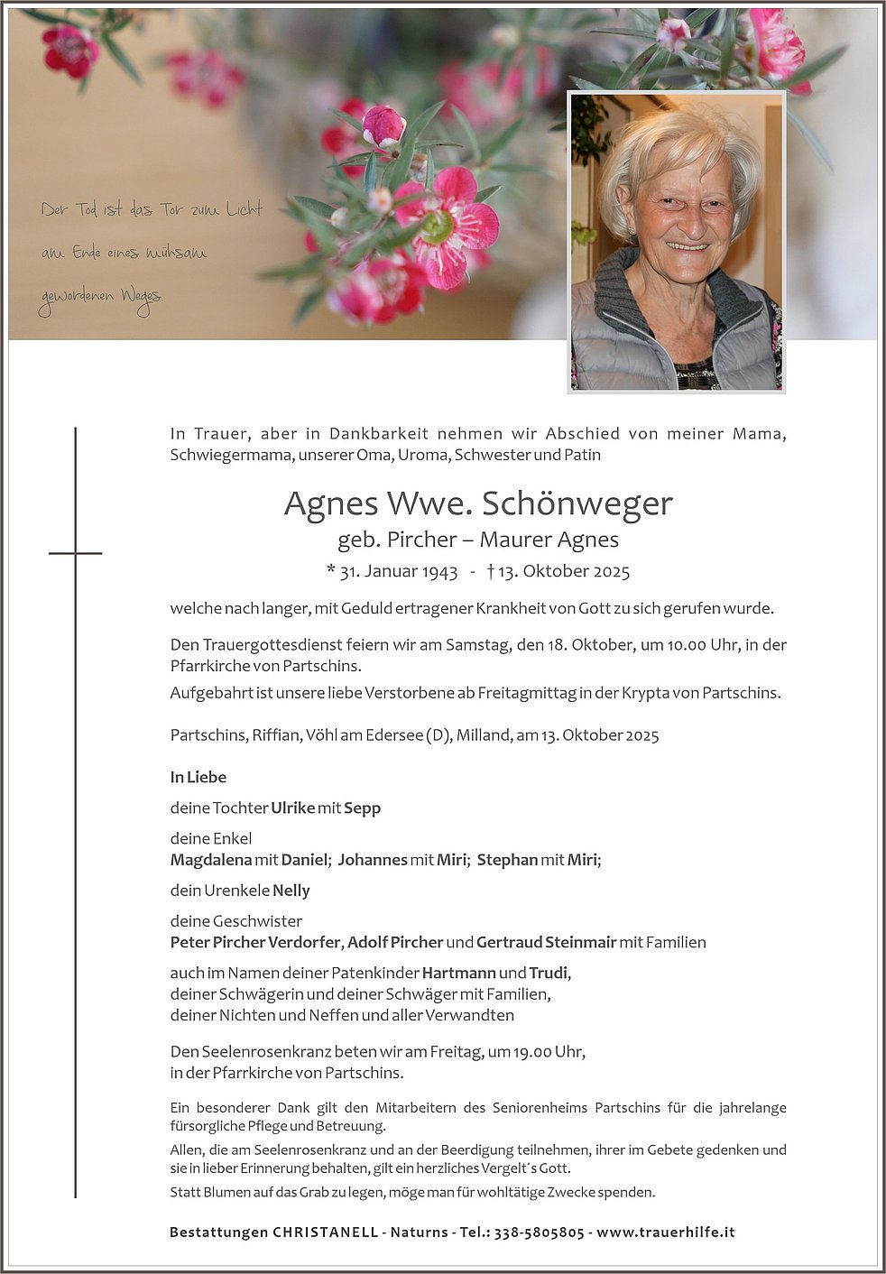 Den Trauergottesdienst feiern wir am Samstag, den 18. Oktober, um 10.00 Uhr, in der Pfarrkirche von Partschins.