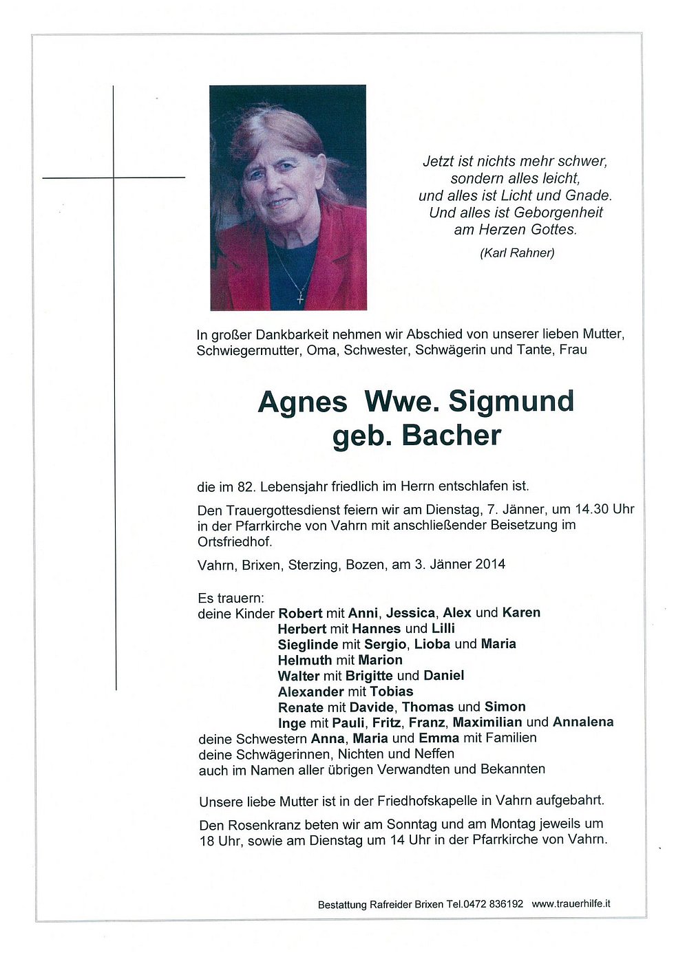 Den Trauergottesdienst feiern wir am Dienstag, 7. Jänner, um 14.30 Uhr in der Pfarrkirche von Vahrn mit anschließender Beisetzung im Ortsfriedhof.
