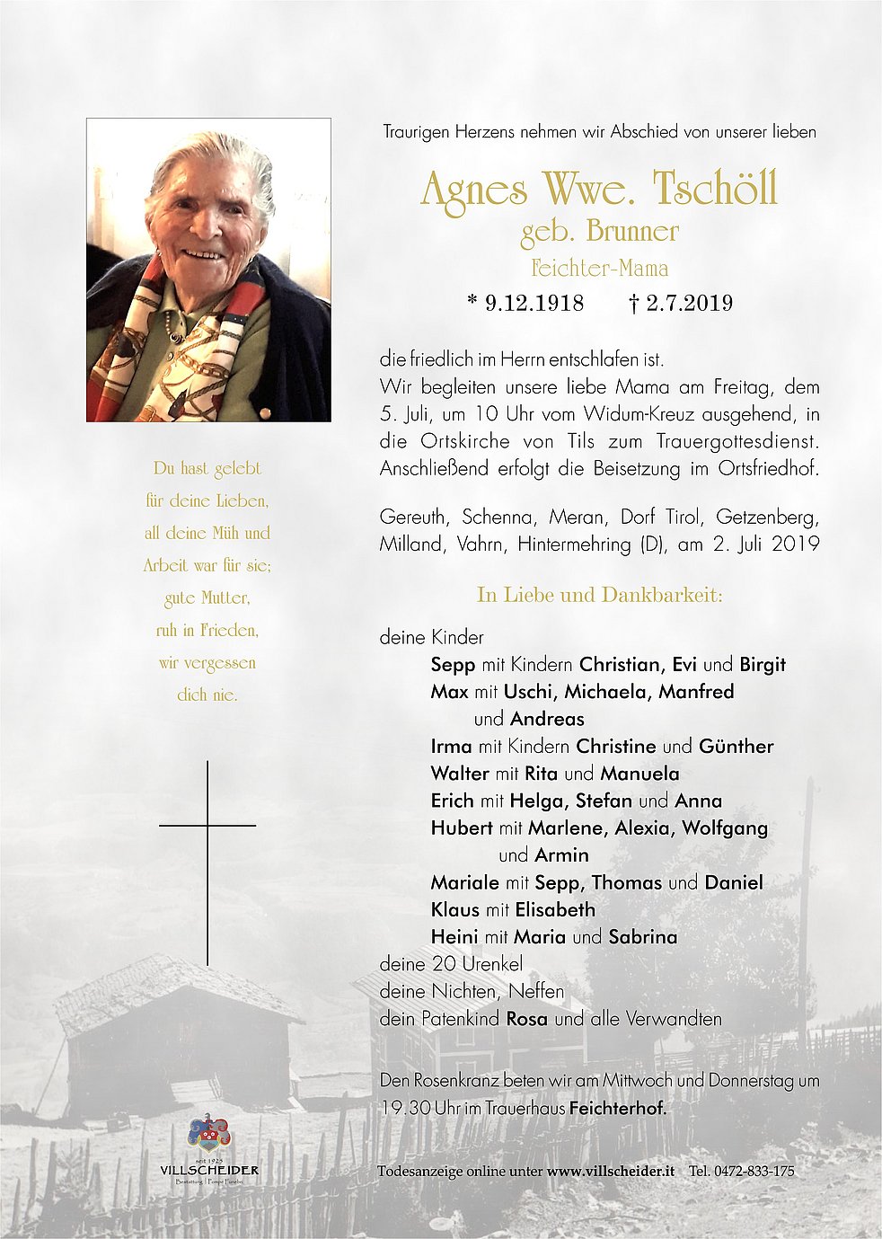 Begräbnisgottesdienst: 05.07. - 10:00 Uhr Widum-Kreuz Tils