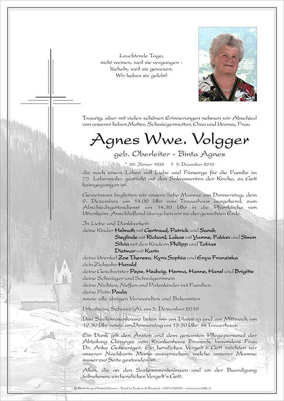 9. Dezember, um 14.00 Uhr vom Trauerhaus ausgehend, zum Abschiedsgottesdienst um 14.30 Uhr in die Pfarrkirche von Uttenheim. Anschließend übergeben wir sie der geweihten Erde.