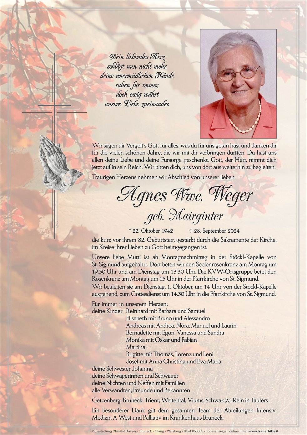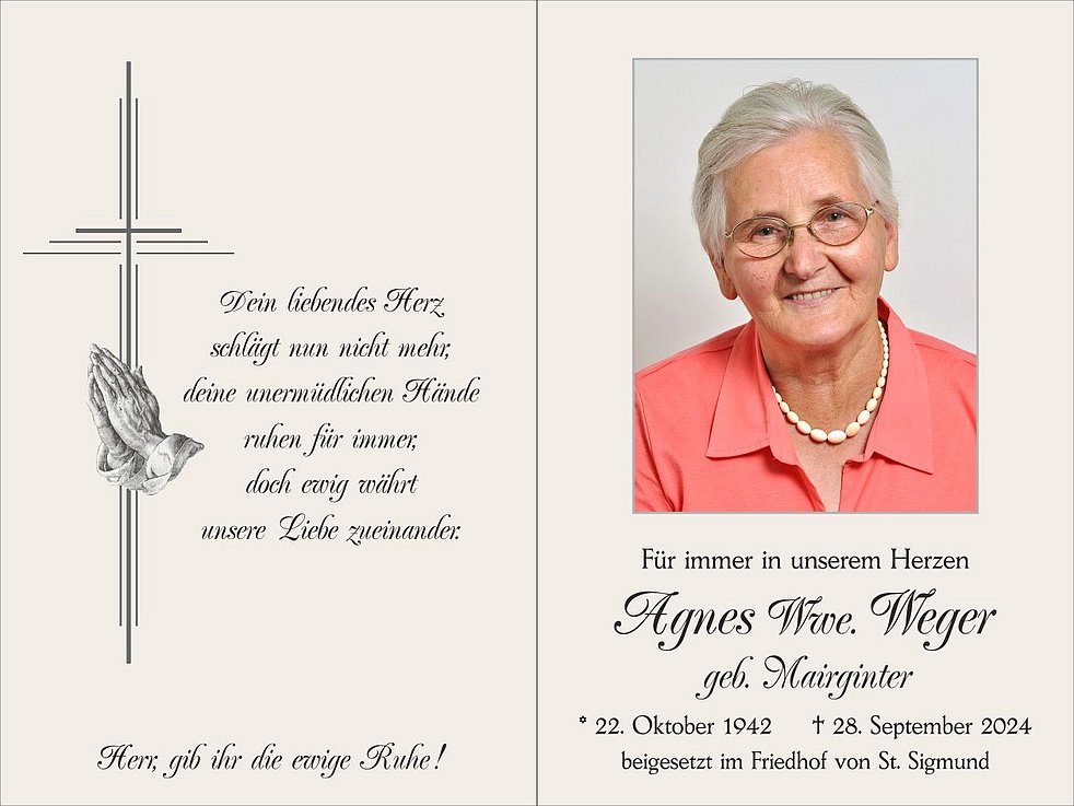 Unsere liebe Mutti ist ab Montagnachmittag in der Stöckl-Kapelle von St. Sigmund aufgebahrt. Dort beten wir den Seelenrosenkranz am Montag um 19.30 Uhr und am Dienstag um 13.30 Uhr. Die KVW-Ortsgruppe betet den Rosenkranz am Montag um 15 Uhr in der Pfarrkirche von St. Sigmund.