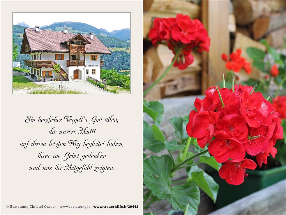 Wir sagen dir Vergelt’s Gott für alles, was du für uns getan hast und danken dir für die vielen schönen Jahre, die wir mit dir verbringen durften. Du hast uns allen deine Liebe und deine Fürsorge geschenkt. Gott, der Herr, nimmt dich jetzt auf in sein Reich. Wir bitten dich, uns von dort aus weiterhin zu begleiten.