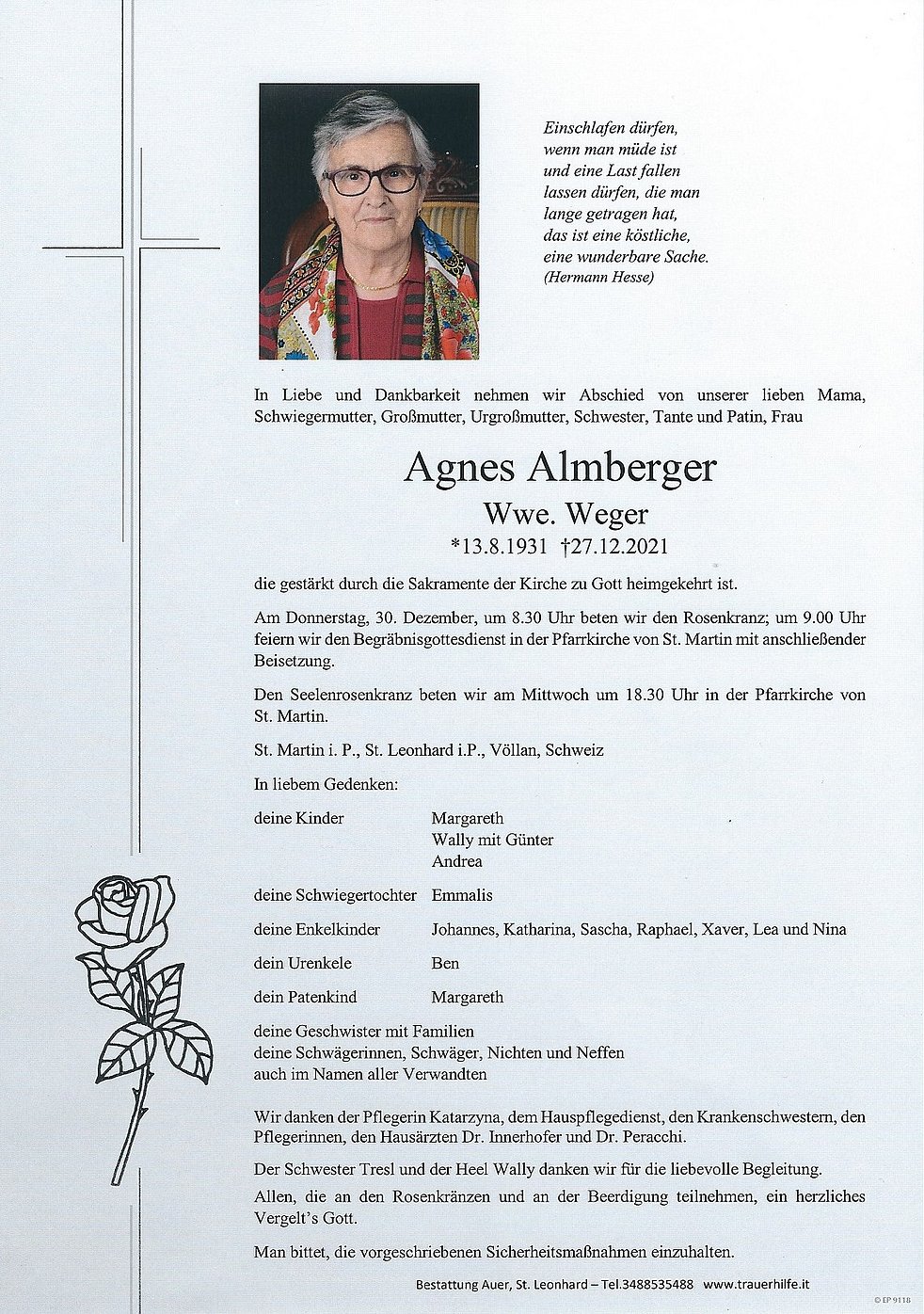 Wir danken der Pflegerin Katarzyna, dem Hauspflegedienst, den Krankenschwestern, den Pflegerinnen, den Hausärzten Dr. Innerhofer und Dr. Peracchi.