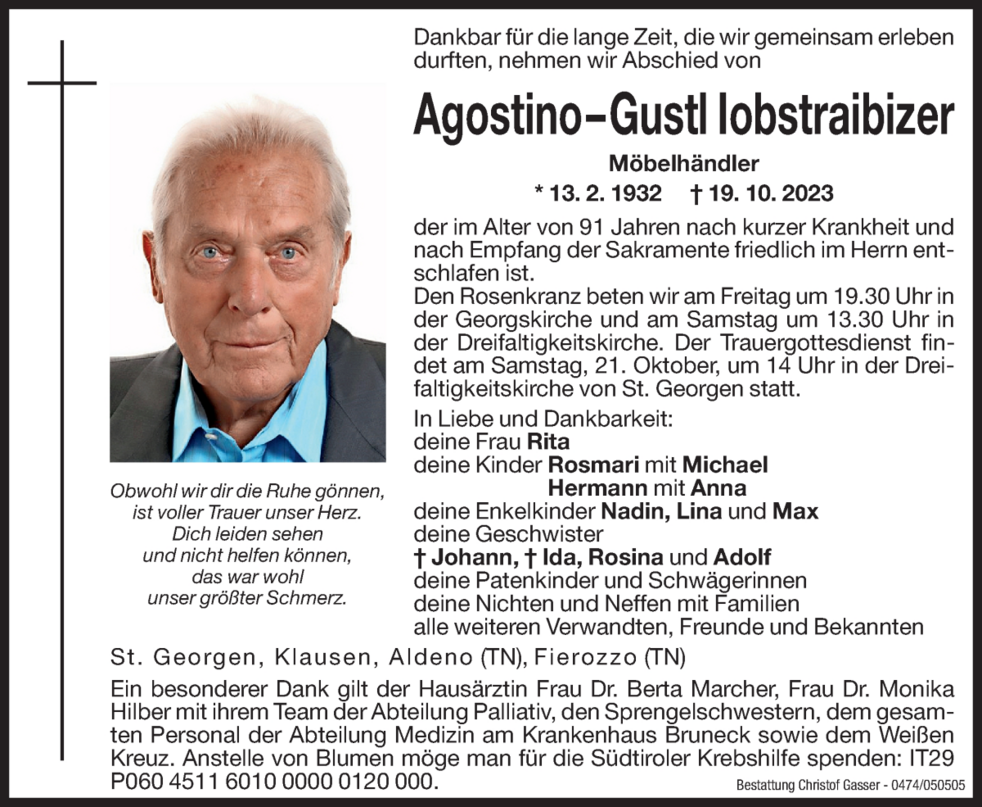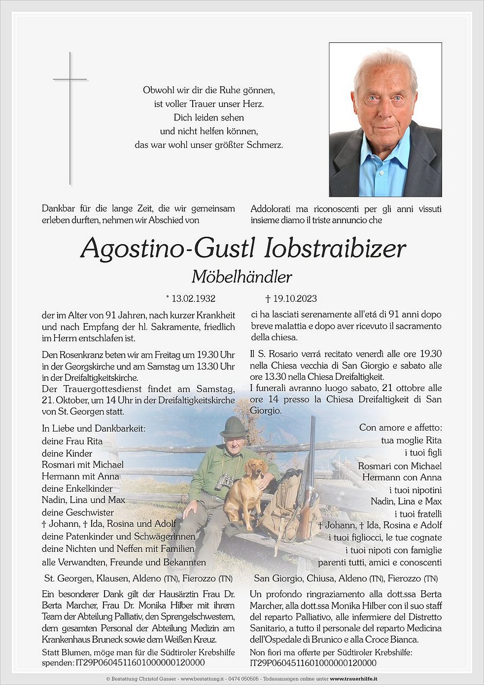 Statt Blumen, möge man für die Südtiroler Krebshilfe spenden: IT29P0604511601000000120000