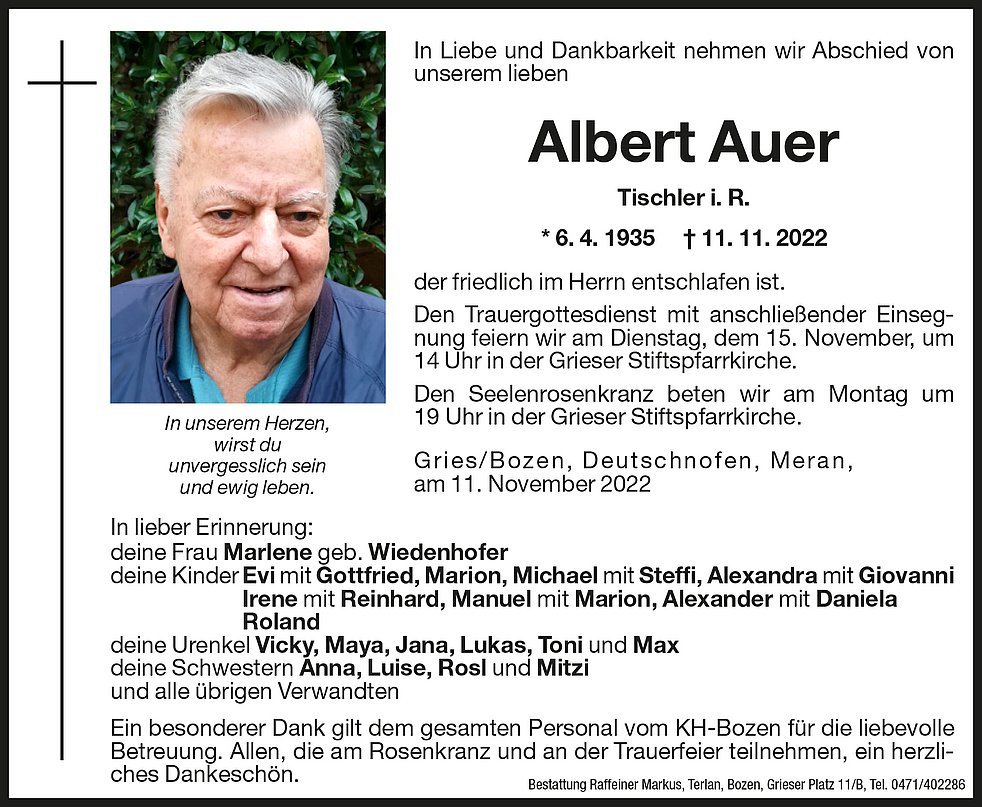 Den Trauergottesdienst mit anschließender Einsegnung feiern wir am Dienstag, dem 15. November, um 14 Uhr in der Grieser Stiftspfarrkirche.