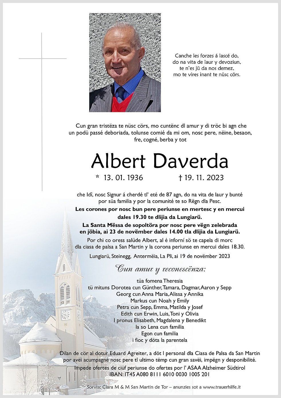 Condolianzes a düc chi de familia. Albert palsede saurì tal lominus de paraisc
