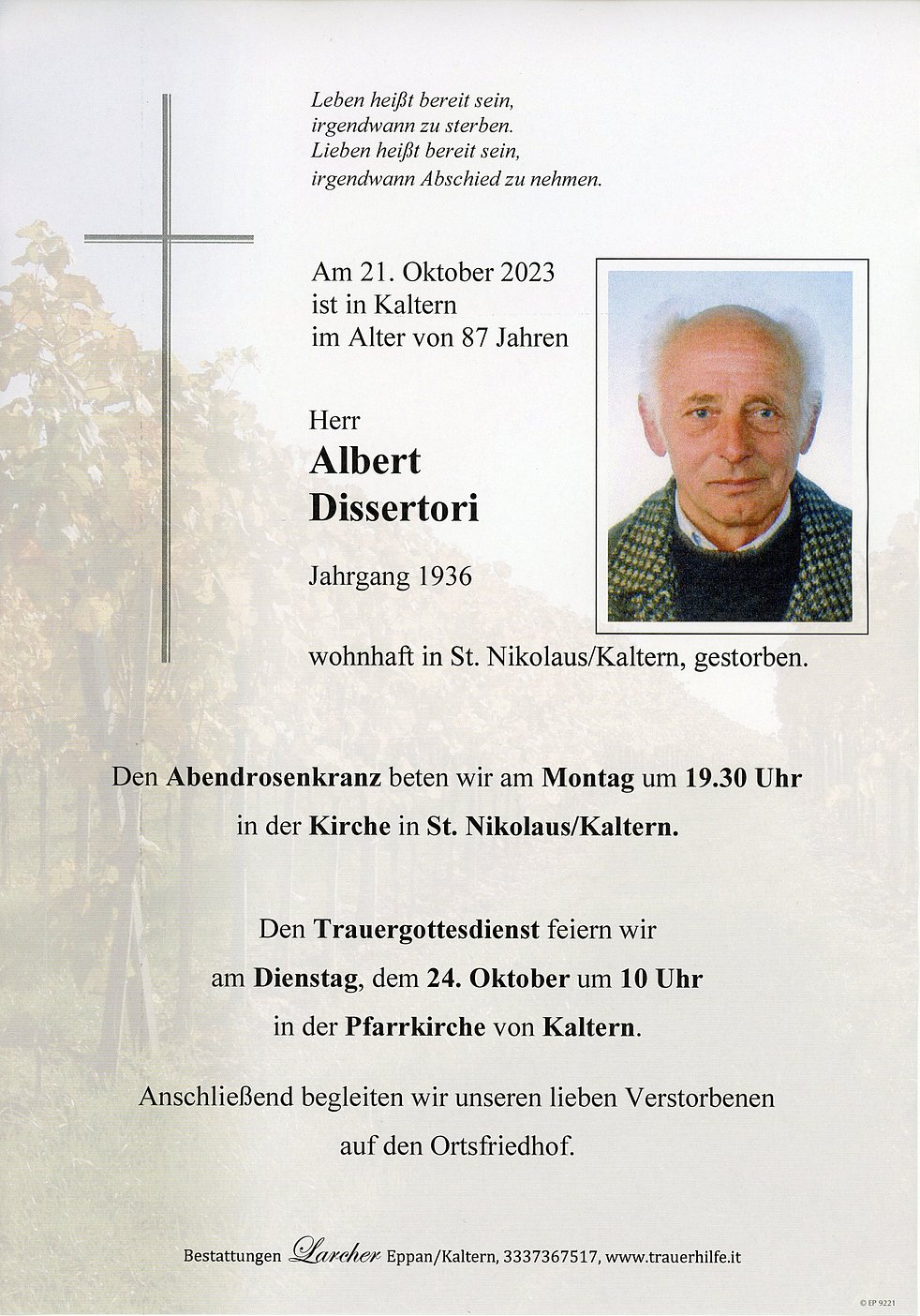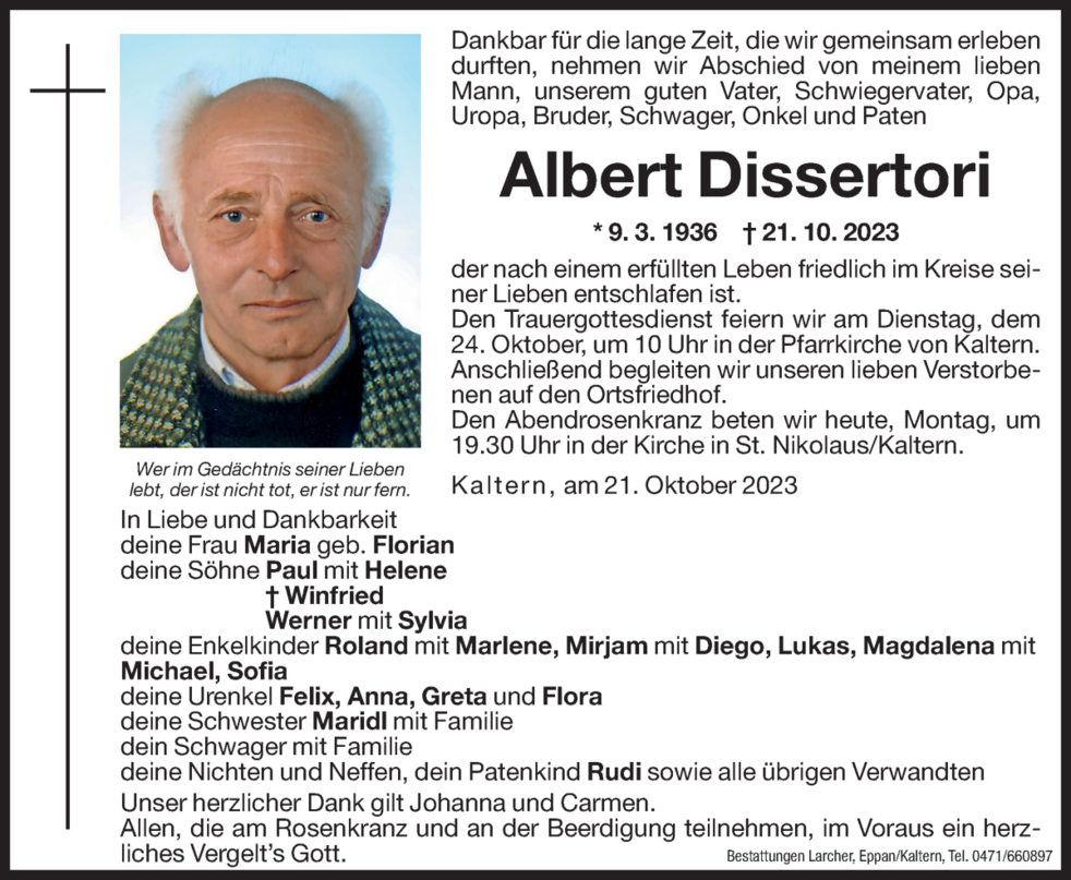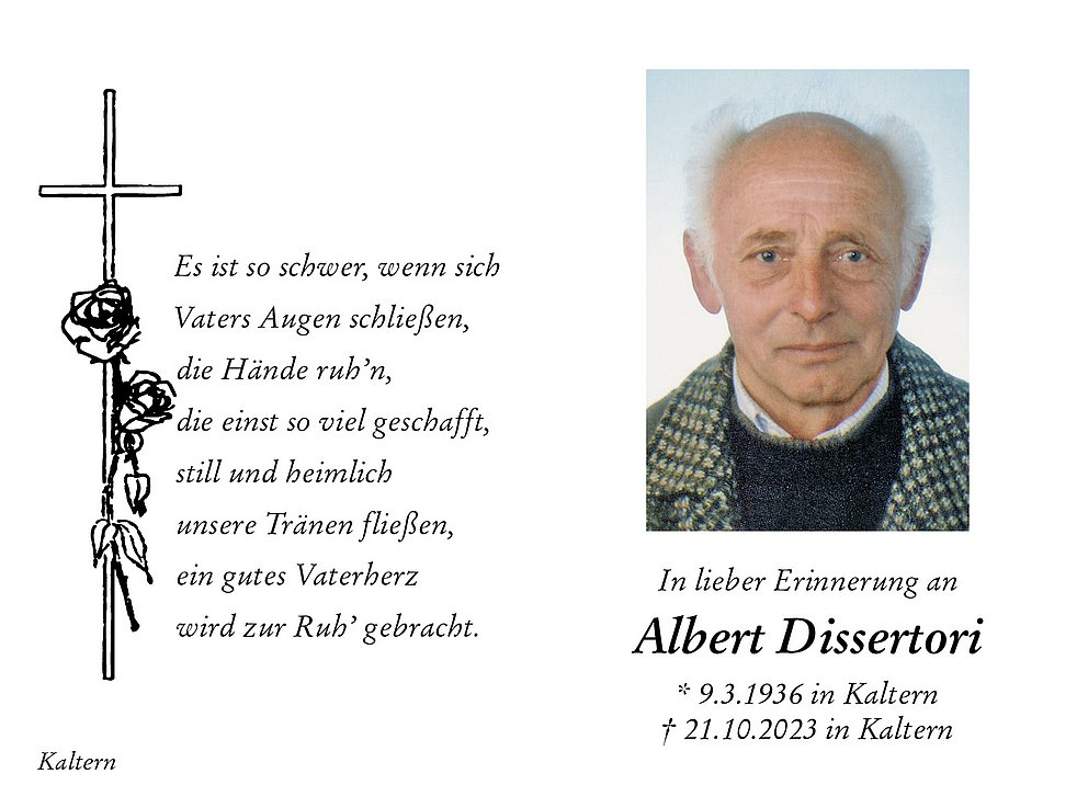 Den Trauergottesdienst feiern wir am Dienstag, dem 24. Oktober um 10 Uhr in der Pfarrkirche von Kaltern. Anschließend begleiten wir unseren lieben Verstorbenen auf den Ortsfriedhof.