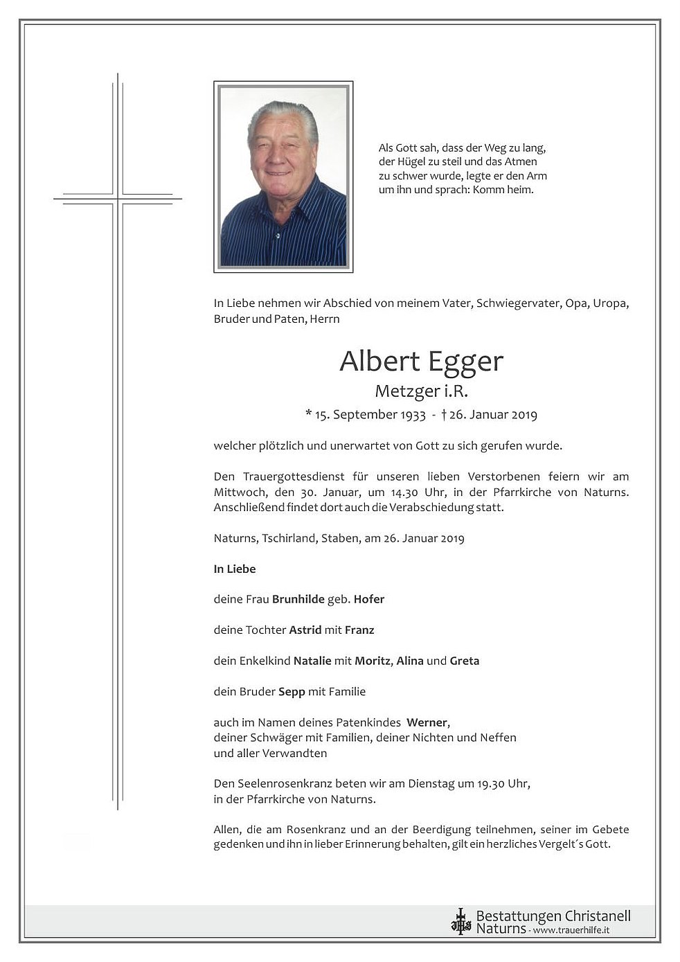 Den Trauergottesdienst für unseren lieben Verstorbenen feiern wir am Mittwoch, den 30. Januar, um 14.30 Uhr, in der Pfarrkirche von Naturns. Anschließend findet dort auch die Verabschiedung statt.