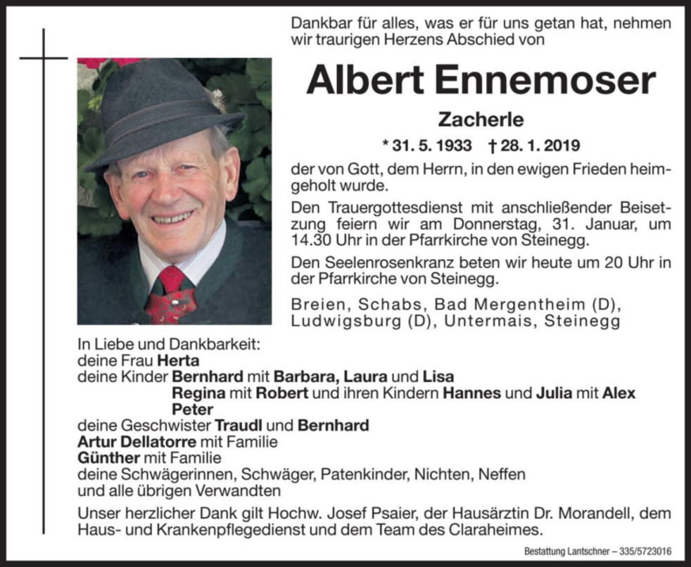 31. Januar, um 14.30 Uhr in der Pfarrkirche von Steinegg.