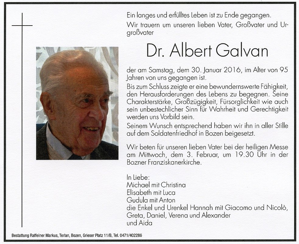 Seinem Wunsch entsprechend haben wir ihn in aller Stille auf dem Soldatenfriedhof in Bozen beigesetzt.