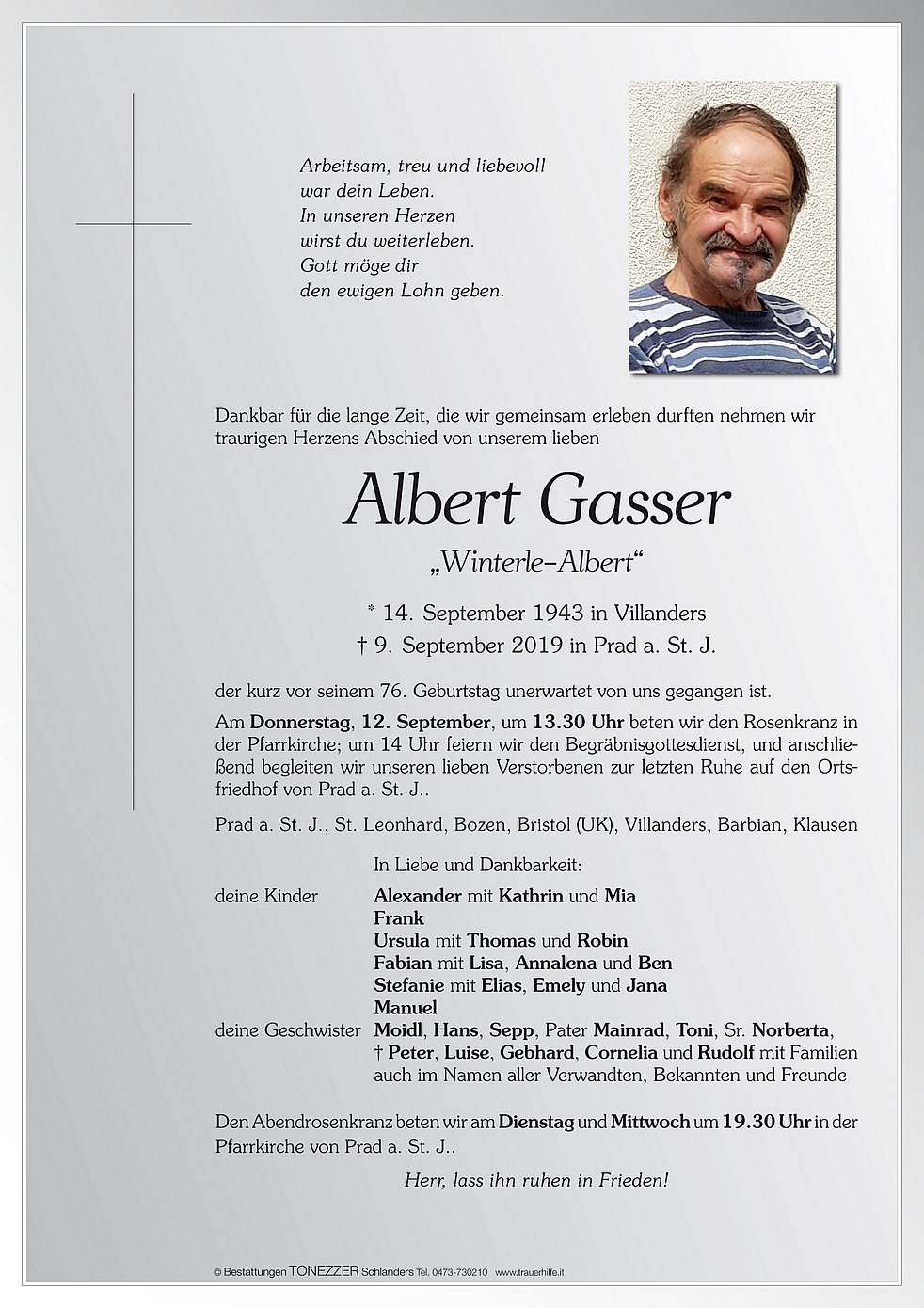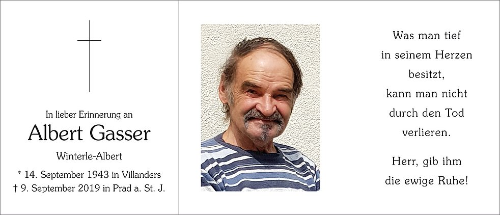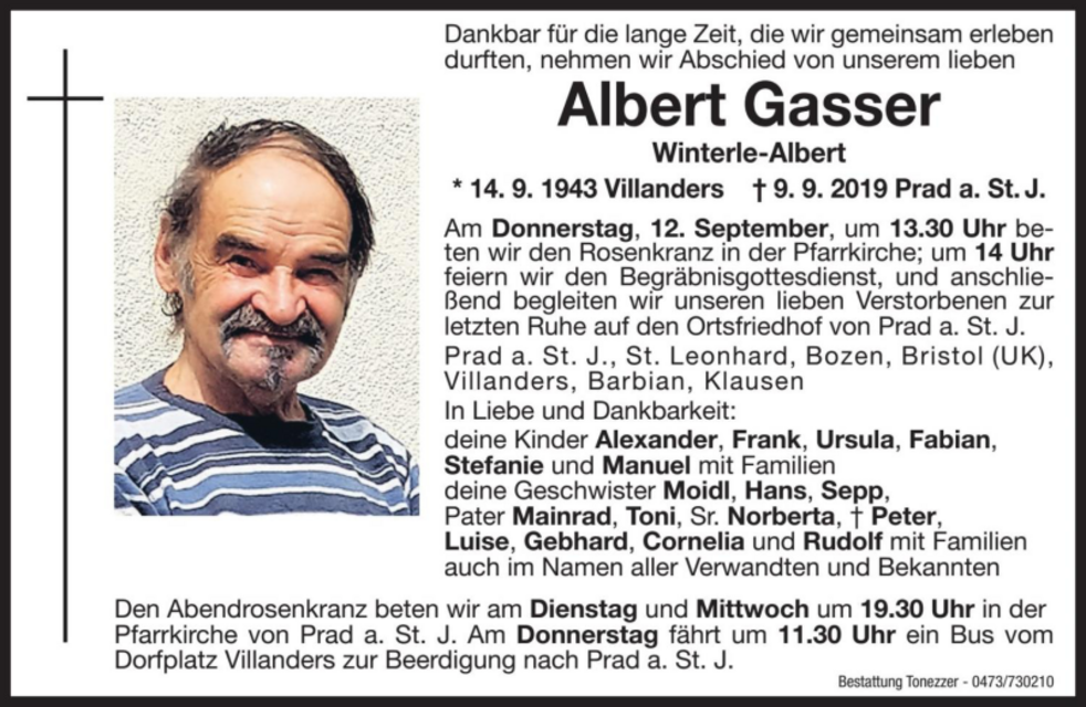 Am Donnerstag, 12. September, um 13.30 Uhr beten wir den Rosenkranz in der Pfarrkirche; um 14 Uhr feiern wir den Begräbnisgottesdienst, und anschließend begleiten wir unseren lieben Verstorbenen zur letzten Ruhe auf den Ortsfriedhof von Prad a. St. J..