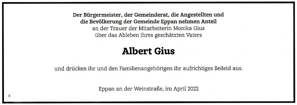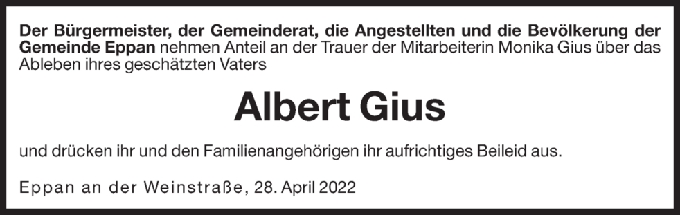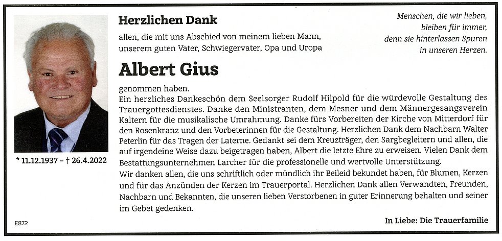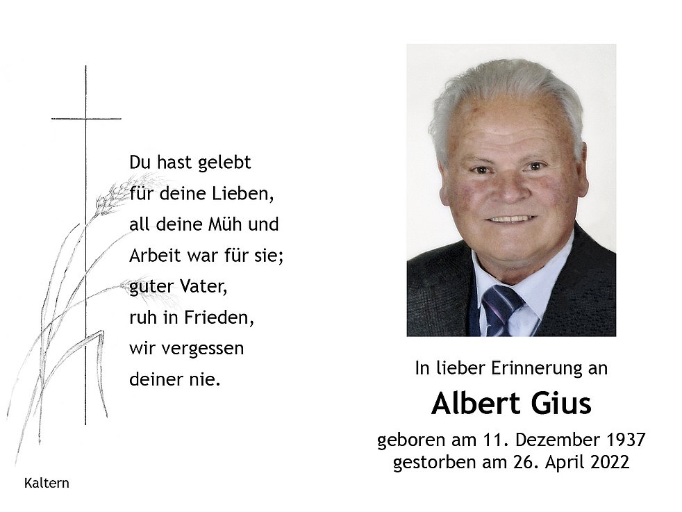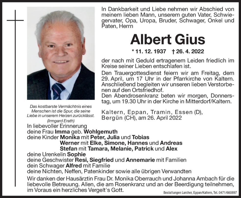 Den Trauergottesdienst feiern wir am Freitag, dem 29. April um 17 Uhr in der Pfarrkirche von Kaltern. Anschließend begleiten wir unseren lieben Verstorbenen auf den Ortsfriedhof.
