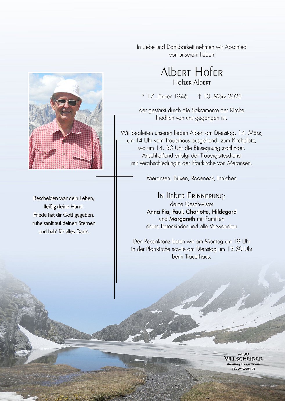 Lieber Albert, du worsch ollm a sympatischer Mensch. Ba die AVS Ausfluege hosch mir oft Mut zuigsprochn. I hon gean gered mit dir. I wuensch dir a guita Reise und den Hinterbliebenen wuensch i viel Kroft und druck ihnen mein aufrichtiges Beileid aus.