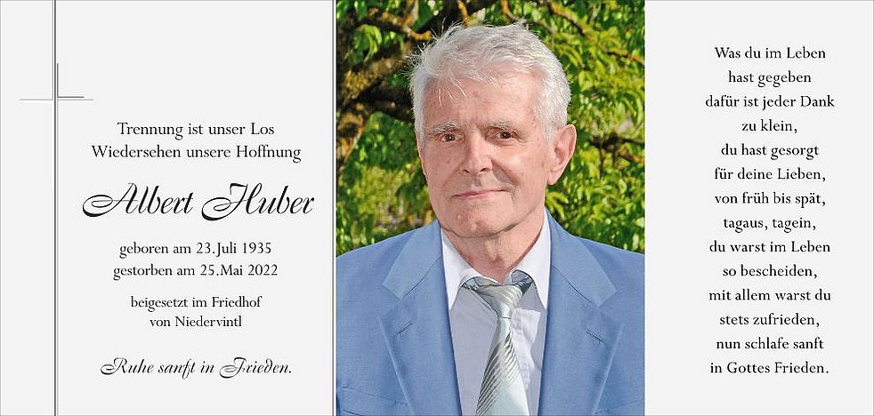 Wir verabschieden uns am Samstag, dem 28. Mai, um 14.30 Uhr in der Pfarrkirche von Niedervintl von unserem lieben Verstorbenen.