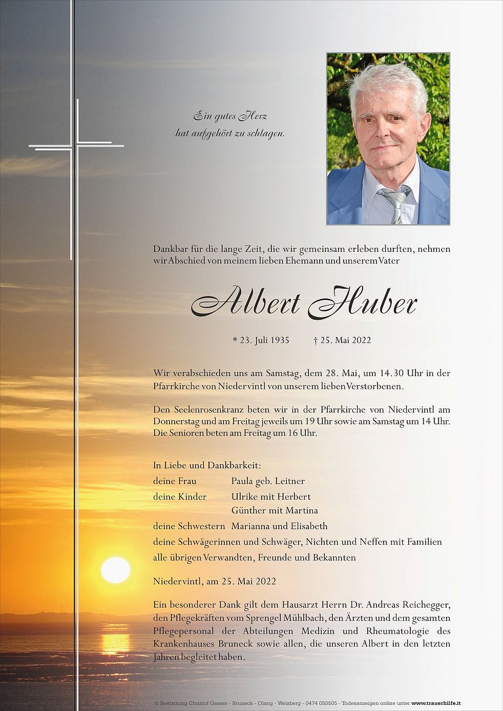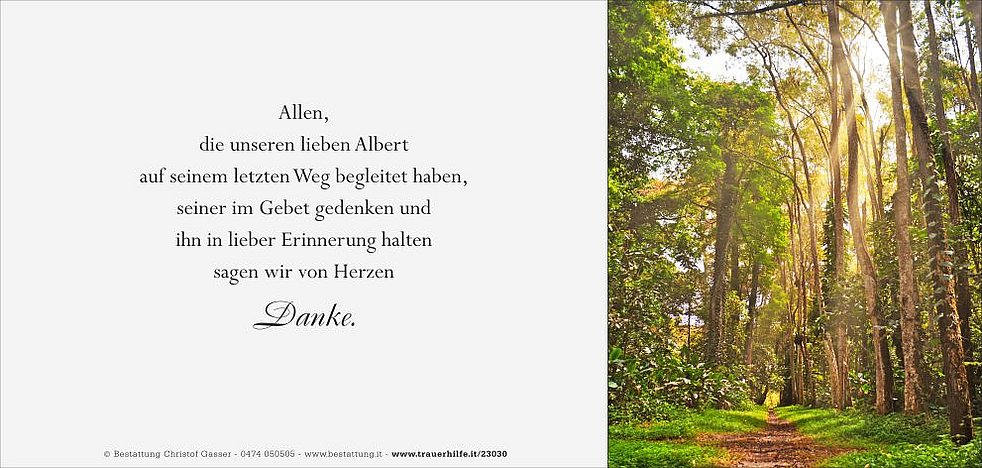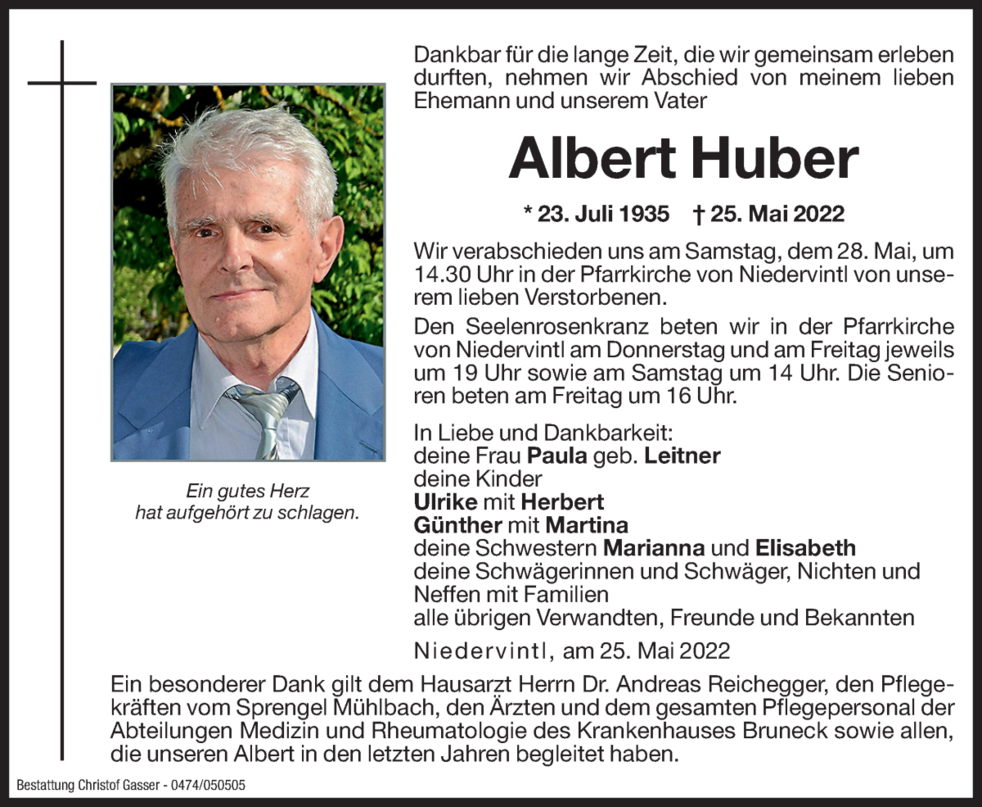 Ein besonderer Dank gilt dem Hausarzt Herrn Dr. Andreas Reichegger, den Pflegekräften vom Sprengel Mühlbach, den Ärzten und dem gesamten Pflegepersonal der Abteilungen Medizin und Rheumatologie des Krankenhauses Bruneck sowie allen, die unseren Albert in den letzten Jahren begleitet haben.