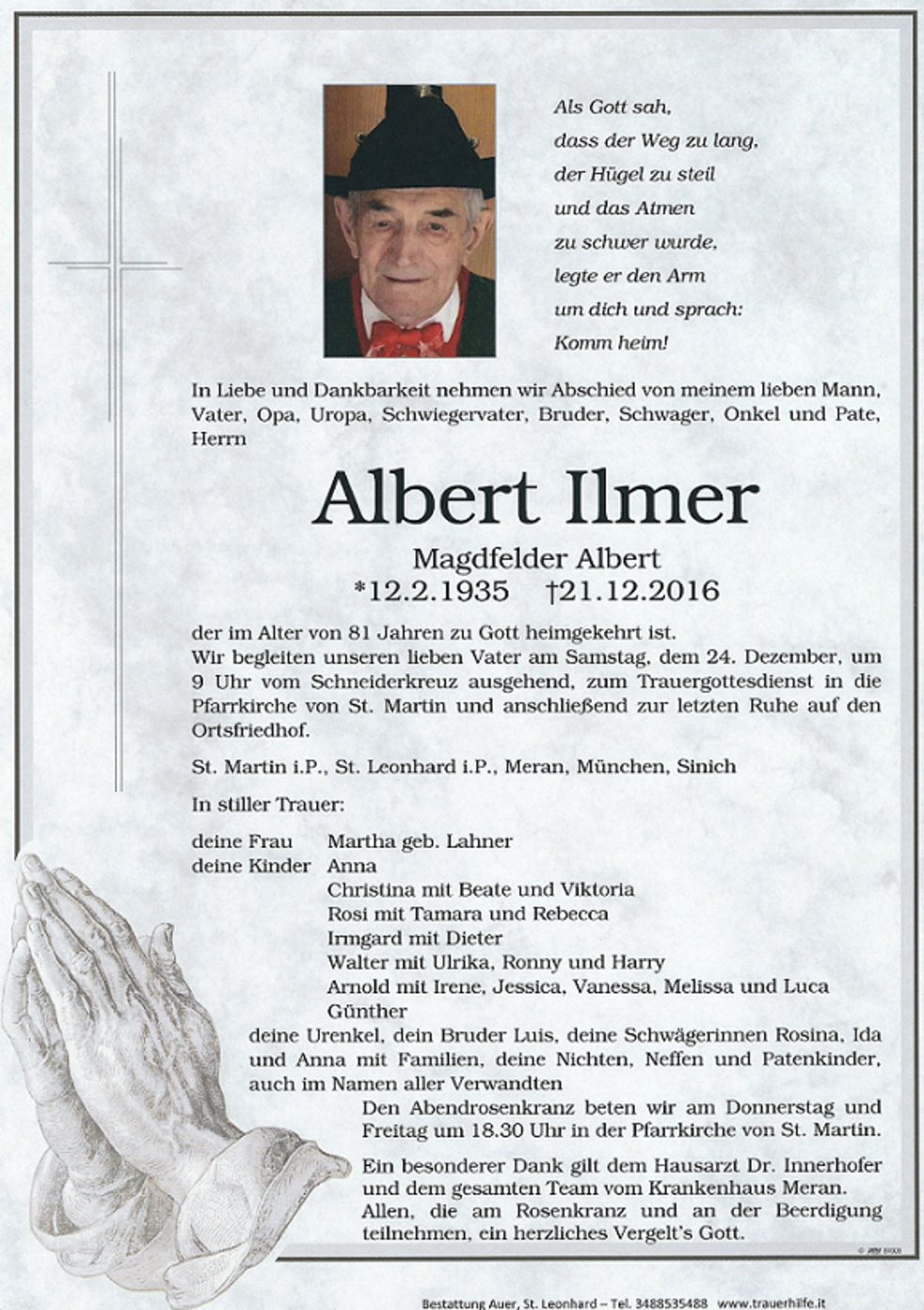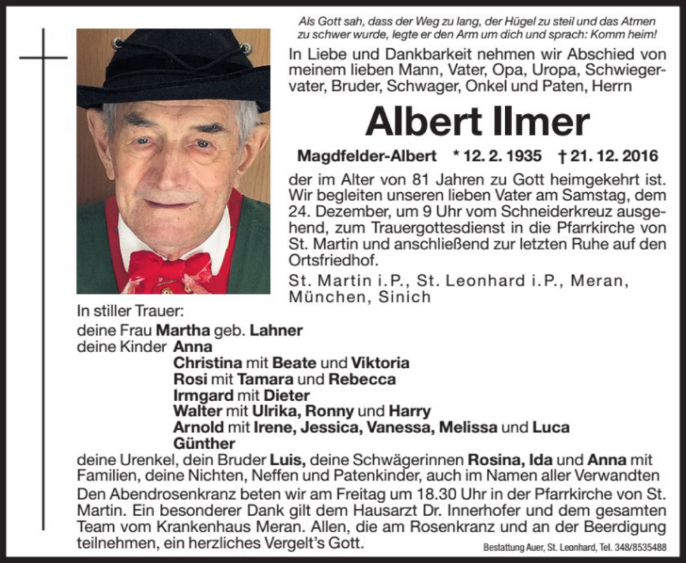 Ein besonderer Dank gilt dem Hausarzt Dr. Innerhofer und dem gesamten Team vom Krankenhaus Meran.