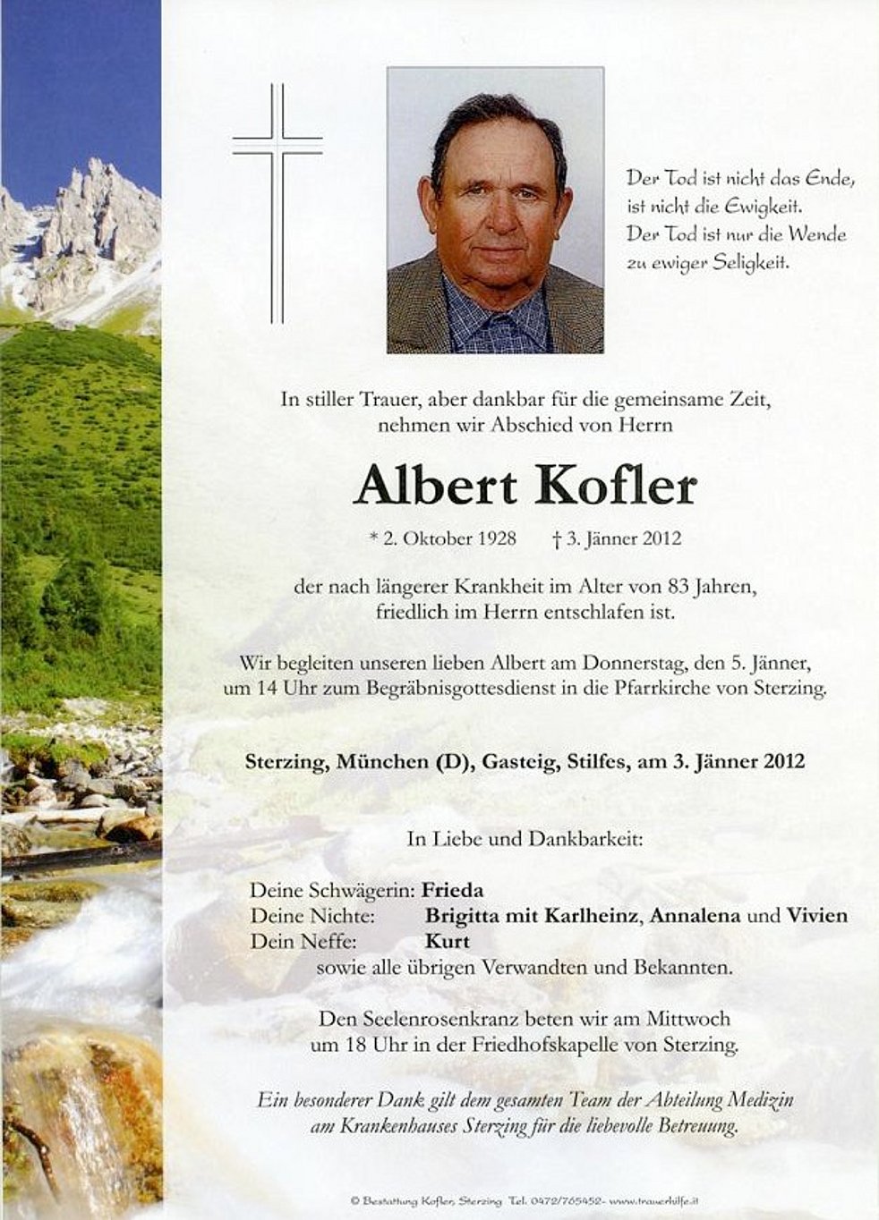 Wir begleiten unseren lieben Albert am Donnerstag, den 5. Jänner,