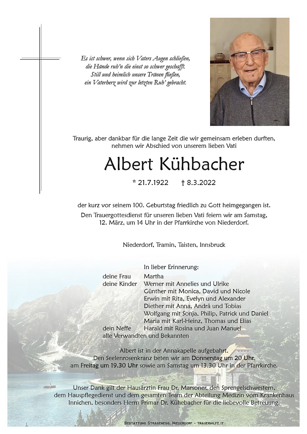 Den Trauergottesdienst für unseren lieben Vati feiern wir am Samstag, 12. März, um 14 Uhr in der Pfarrkirche von Niederdorf.