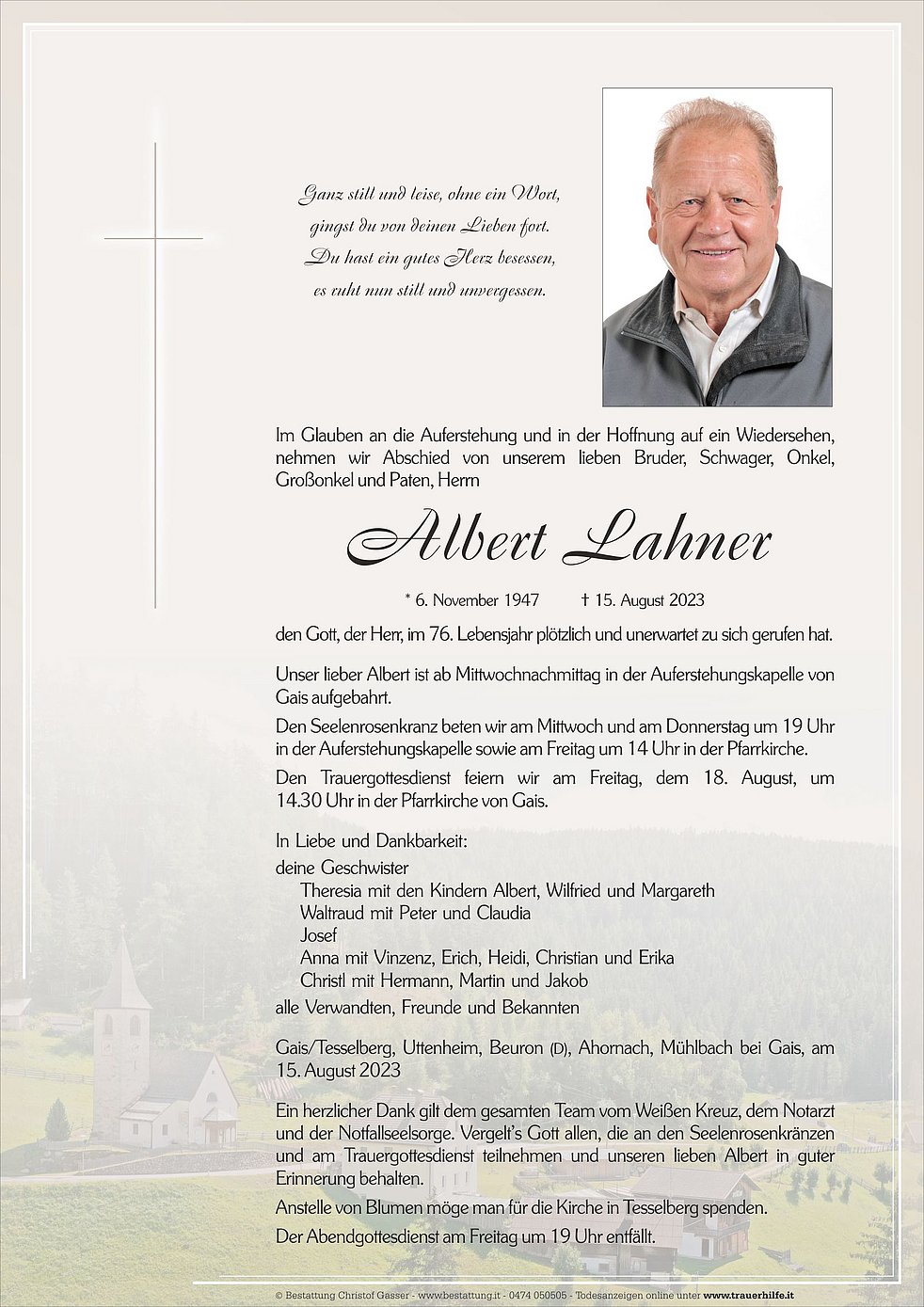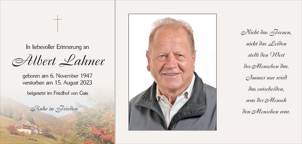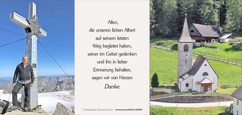 Ein herzlicher Dank gilt dem gesamten Team vom Weißen Kreuz, dem Notarzt und der Notfallseelsorge. Vergelt’s Gott allen, die an den Seelenrosenkränzen und am Trauergottesdienst teilnehmen und unseren lieben Albert in guter Erinnerung behalten.